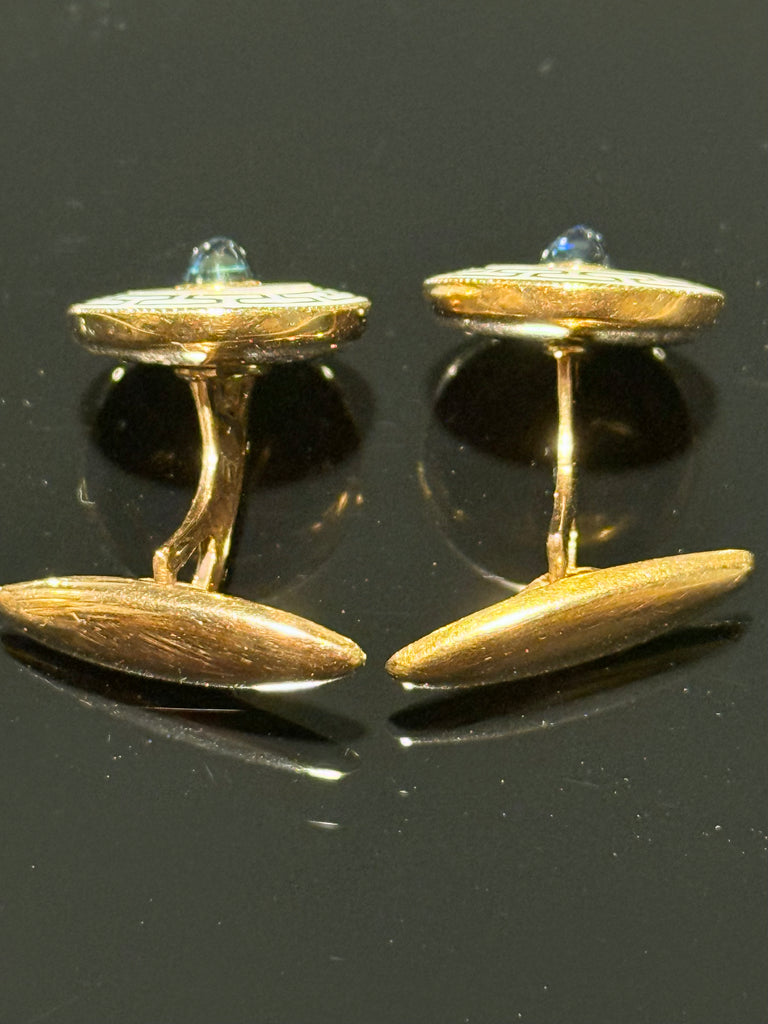 Art Deco 14K. Guld manchetknapper, perlemor og emalje, monteret med blå safir cabochoner. Start 1900 tallet. Stemplet: 585. Totalvægt: 6,8 g. Mål: 2,2x1,5 cm. Stand: se billeder.