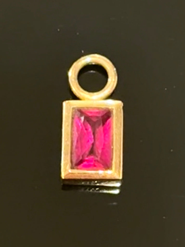 Vintage 8K. Guld charm / vedhæng, med pink ædelsten. Stemplet: 8K. Totalvægt: 0,9 g. Mål: 1,2 x0,5 cm. Stand: se billeder.