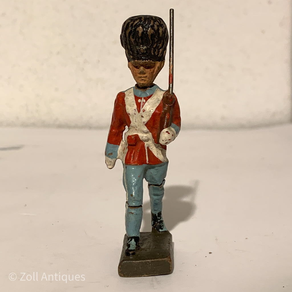 Lineol Kongelig Livgarder marcherende med gevær (med dobbelt skrå rem). Fra 1930/1940érne. Mål: ca. H:8,5cm. ( modelfoto) Flere haves, disse figurer er håndmålet og variere derfor en smule i farver og udtryk. Standen variere også. Stand: Brugsspor, krakeleringer mm.