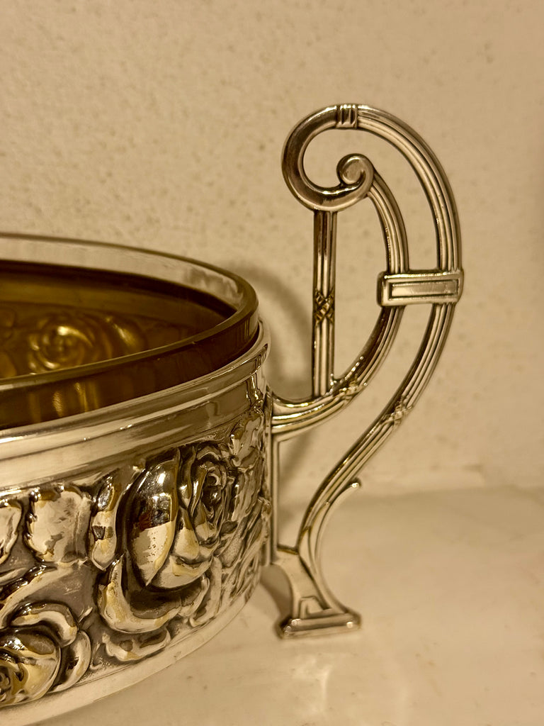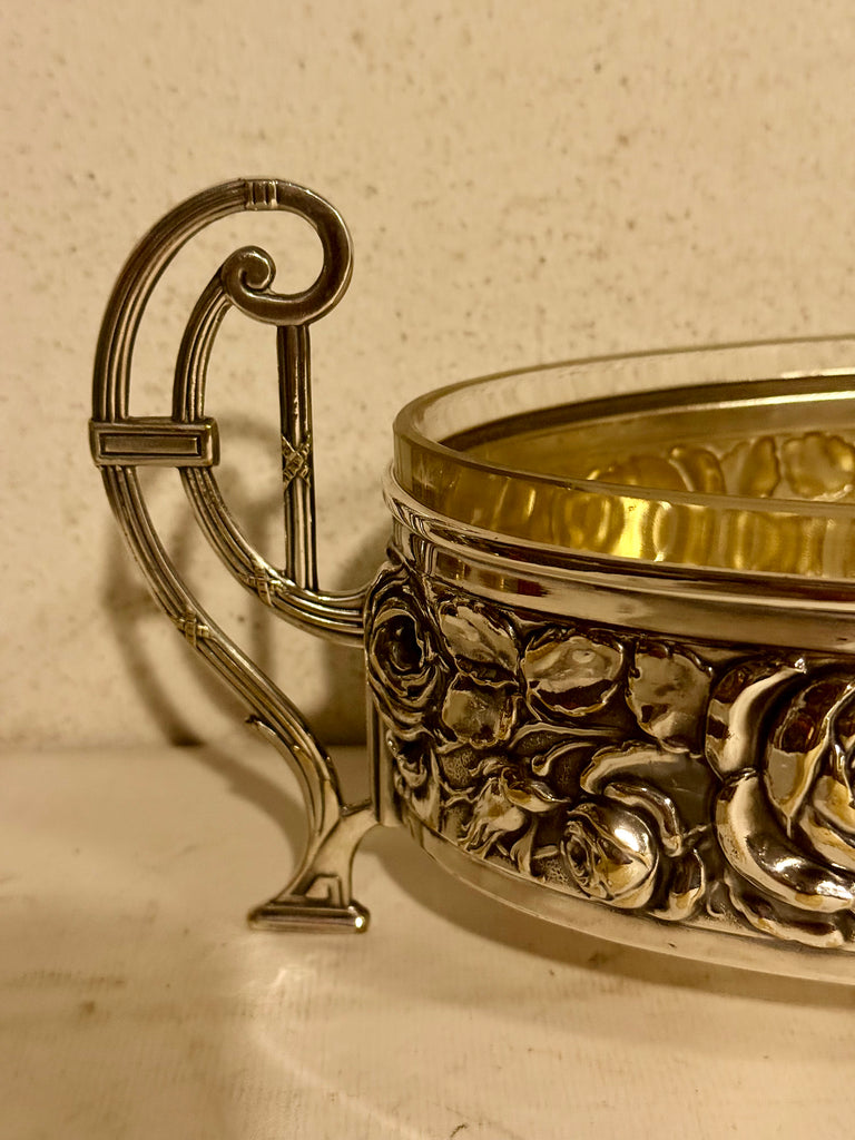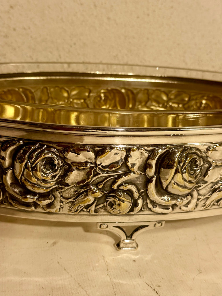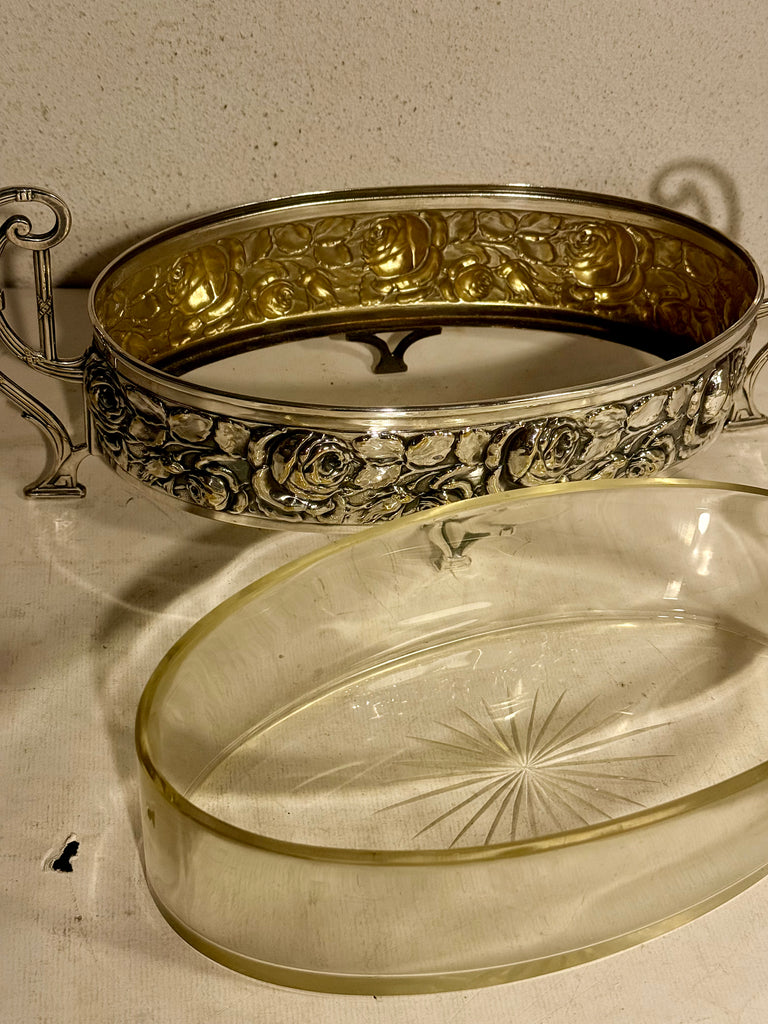 Art deco silver plated brass and glass Jardinere. From the 1930s. Stamped: TB TB. Dimensions: approx. 30x12 cm. Condition: see pictures.