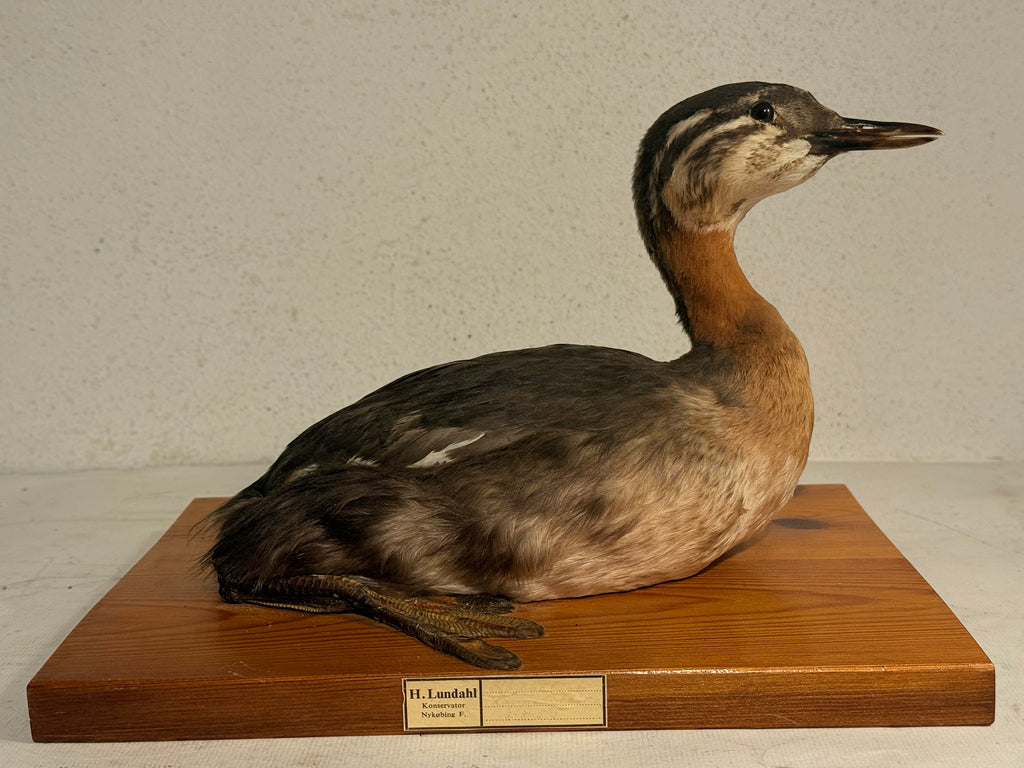 Stuffed bird, Red-necked Grebe (Podiceps griseigena) From 1953. Conservator: H. Lundahl. With labels and pencil writing. Provenance: Belongs to an older private Danish trophy animal collection. Dimensions: Approx. 19x28.5x21 cm. Condition: see pictures.