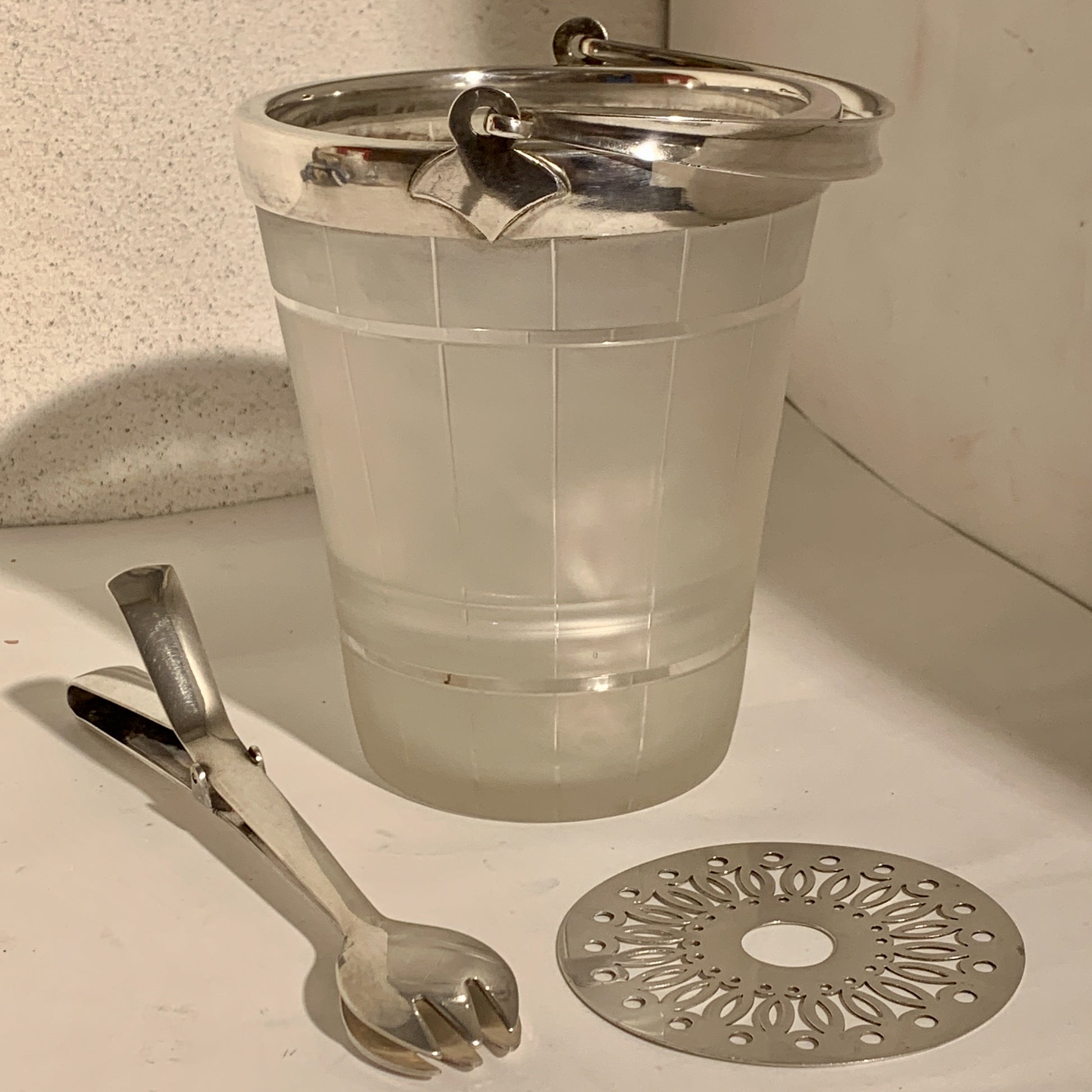 Art Deco silver-plated Ice bucket with tongs and grate, England, from the beginning of the 20th century. Silver-plated metal and frosted glass. Stamp: 4 (on grate) Dimensions of bucket without handle: 15x12.5 cm. Condition: see pictures.
