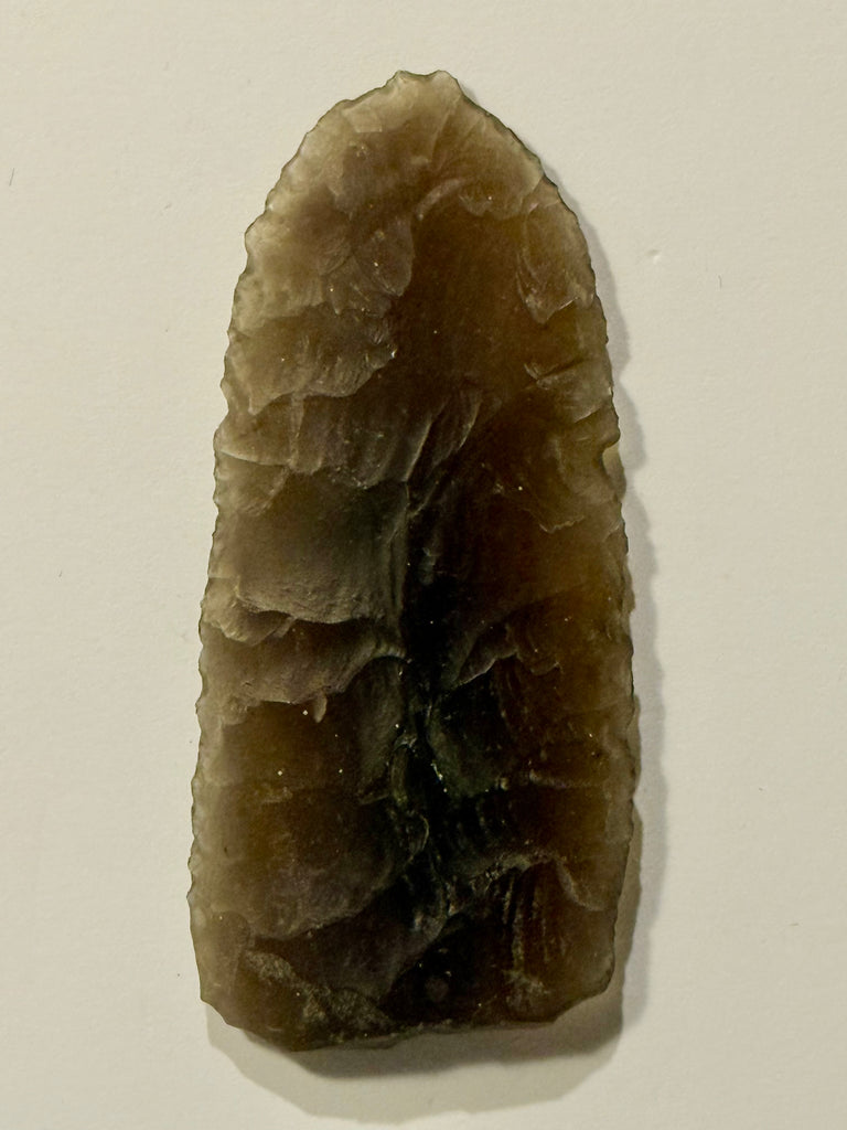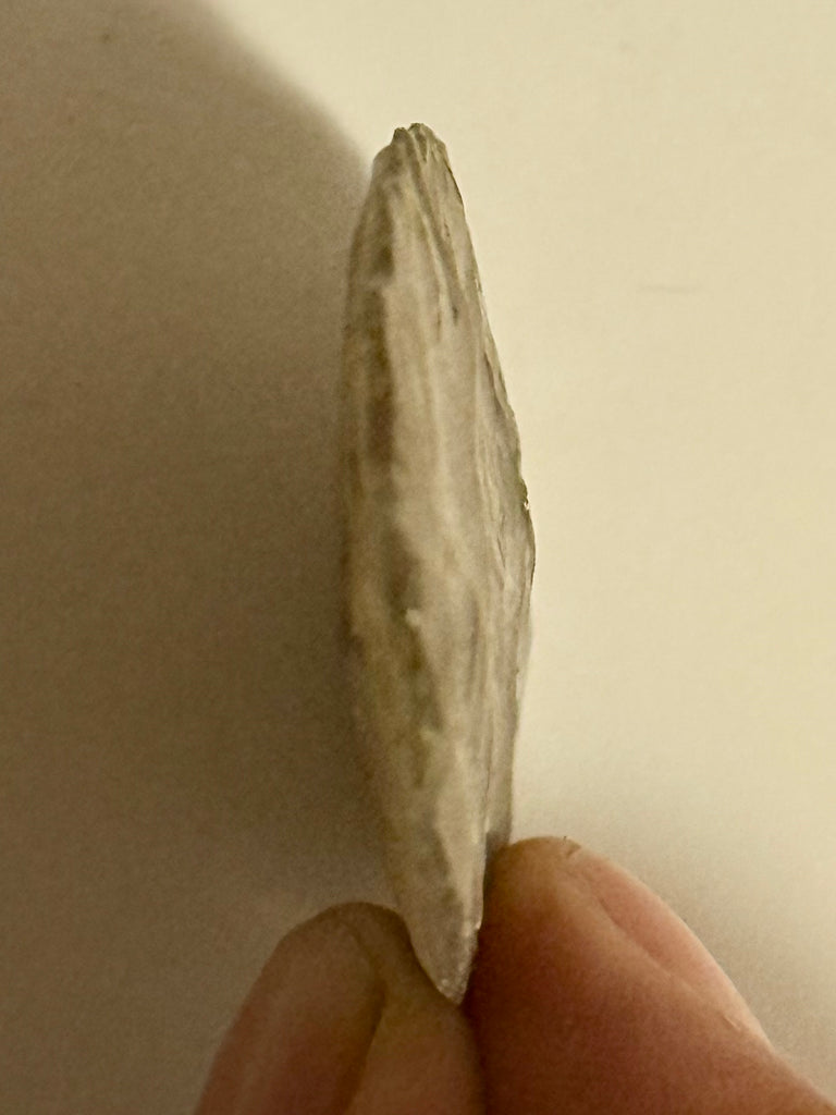 Danish antique. Half of a flint knife. Type C. Early dagger period. Neolithic: Anno 2400-2100 BC. Literature: FLINT by Peter Vang Petersen. Pages 124-125. Provenance: found at Kjellerupgaard, Kjellerup 8620, Denmark. The knife part was found by the then owner of the farm, inherited by his son and sold to us, so the first time in the trade. Dimensions: 8x3.5x0.8 cm. Condition: see pictures.