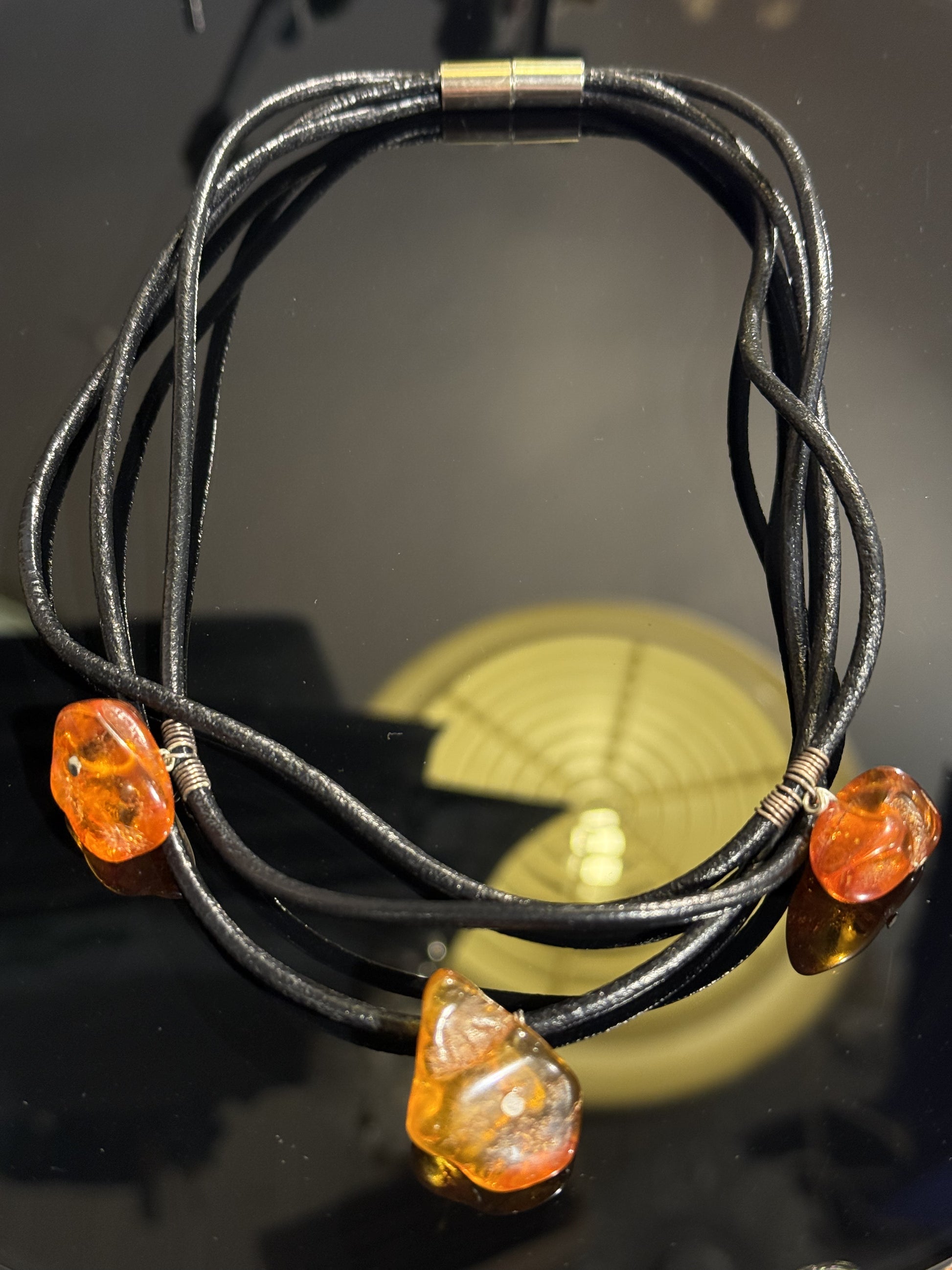 Vintage Amber necklace. Three amber beads attached to a leather cord with magnetic clasp. Dimensions: O: approx. 42 cm. Condition: see pictures.