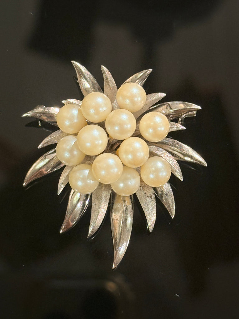 Vintage Sterling silver & pearl brooch, shaped like a flower. Stamped: Sterling. Weight: Approx. 15.3 grams. Dimensions: 4.5x4x2 cm. Condition: see pictures.