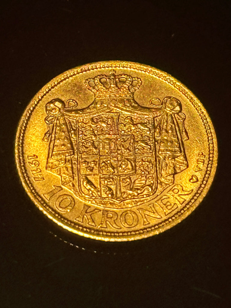 10 kr. Dansk Christian X. 21,6 karat Guldmønt, fra 1917. Totalvægt: 4,5 g. Mål: 18x1 mm. Stand: se billeder.