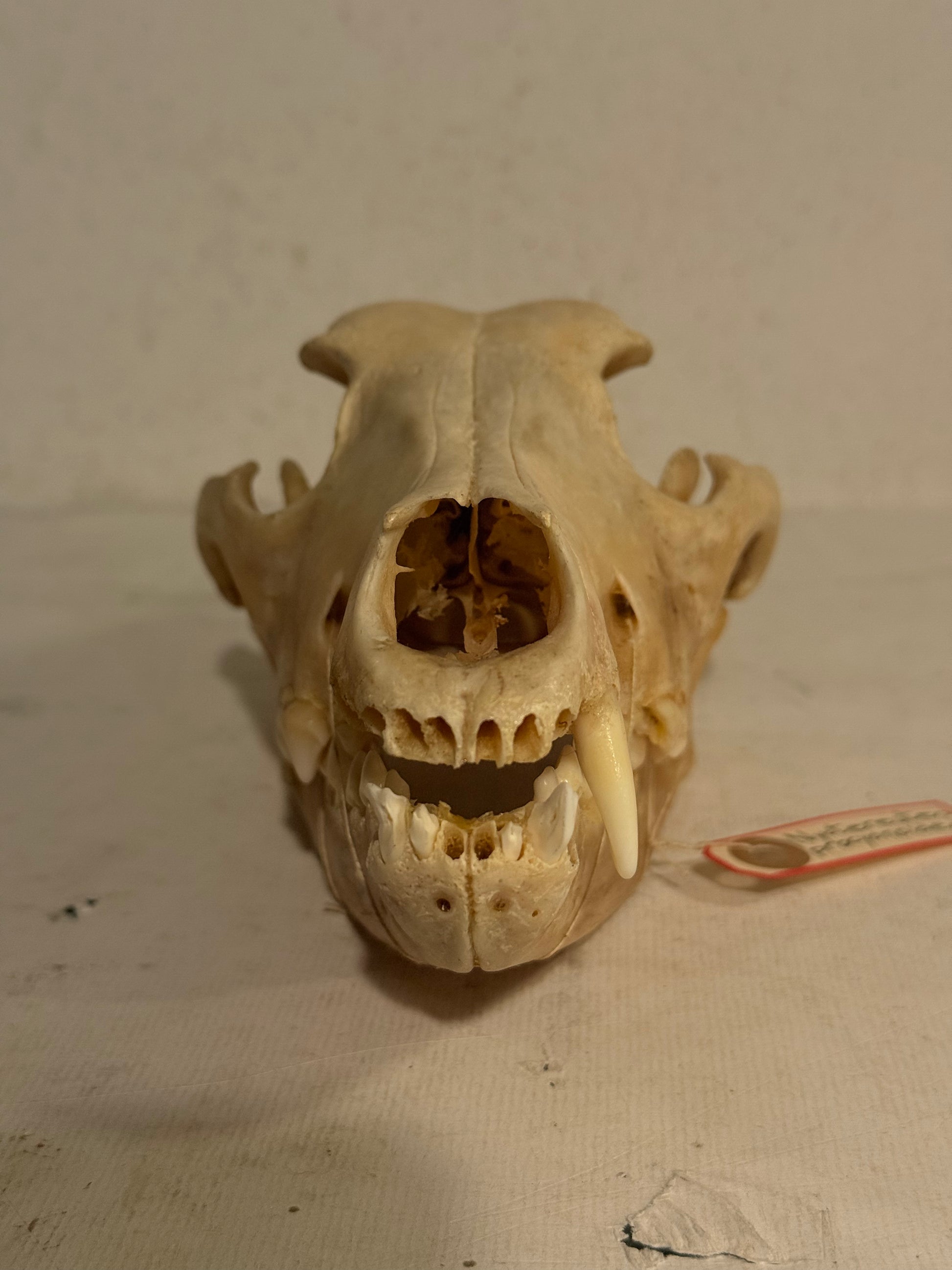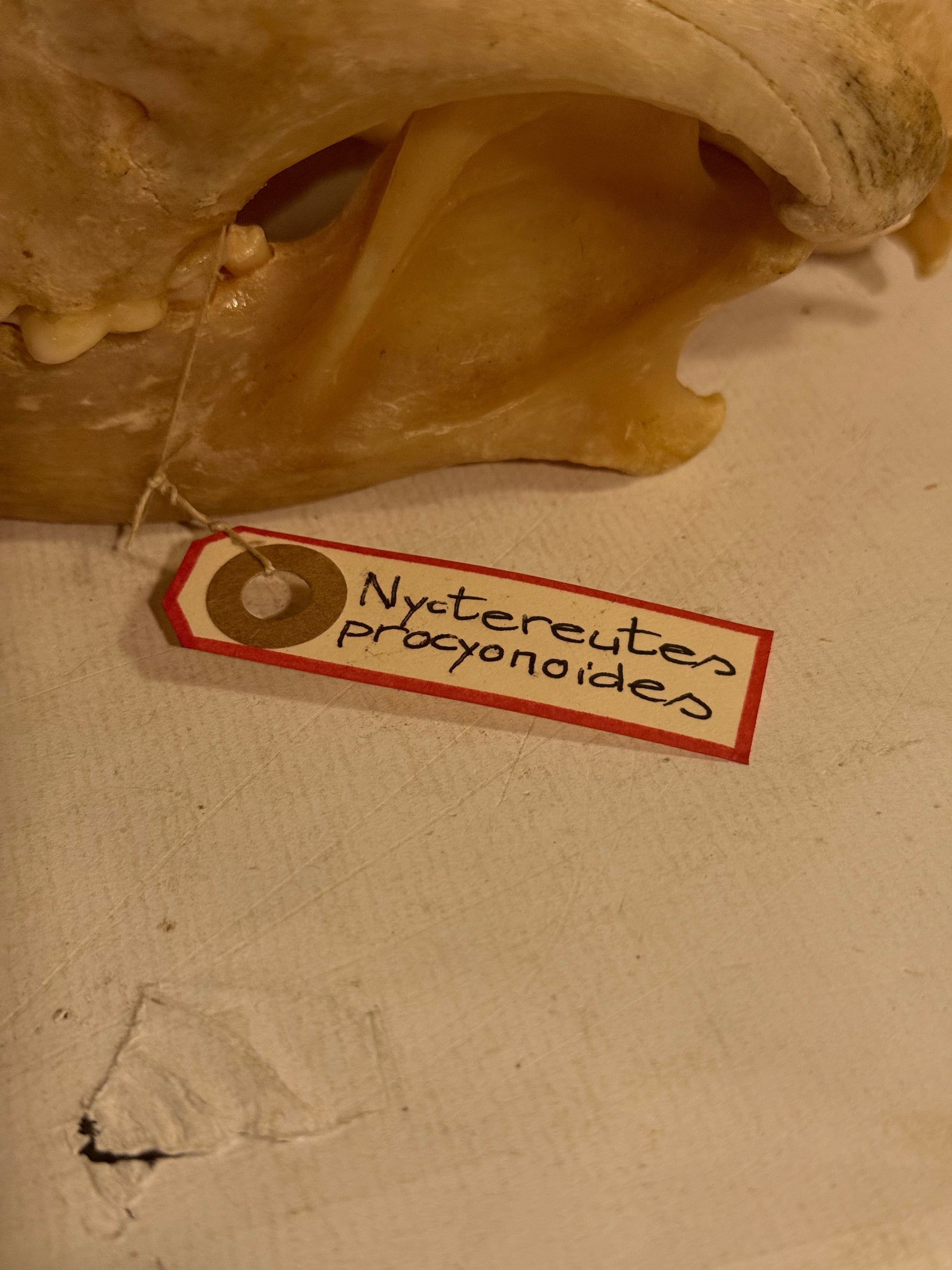 Ægte Mårhund kranie (Nyctereutes procyonoides) med latin mærkat. Mål: ca. 21,5x10x12 cm. Stand: se billeder.