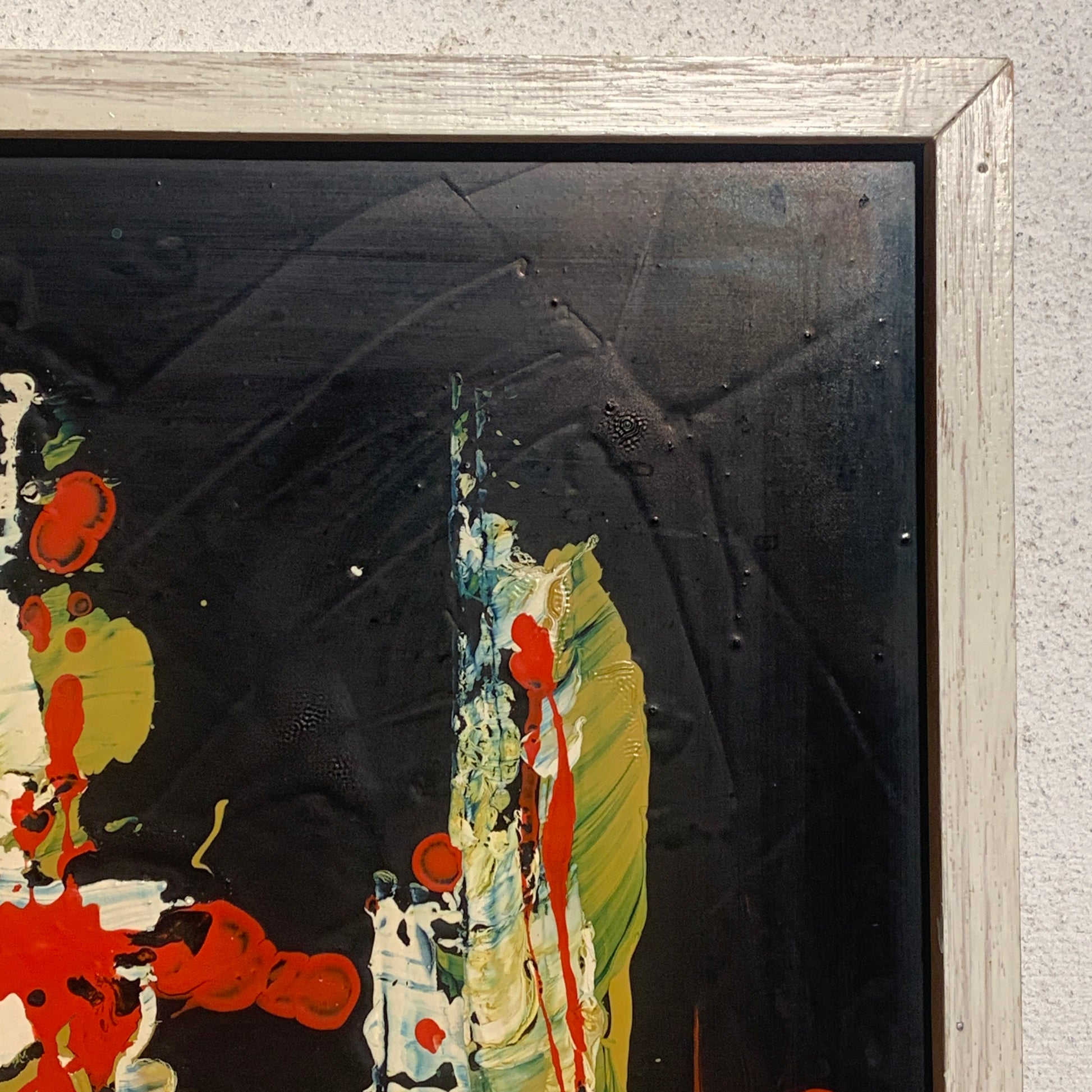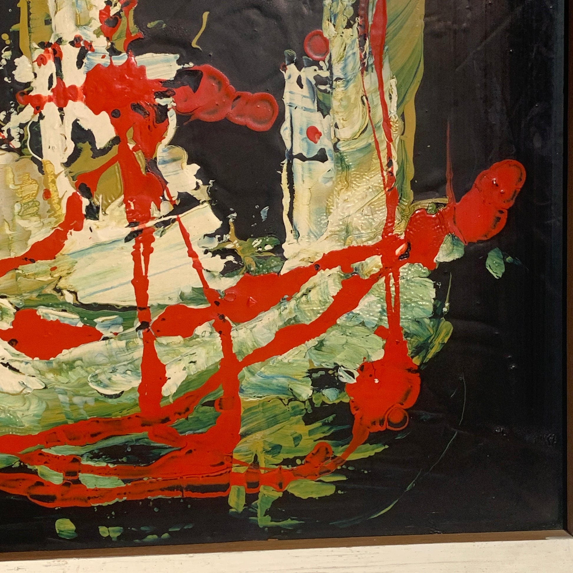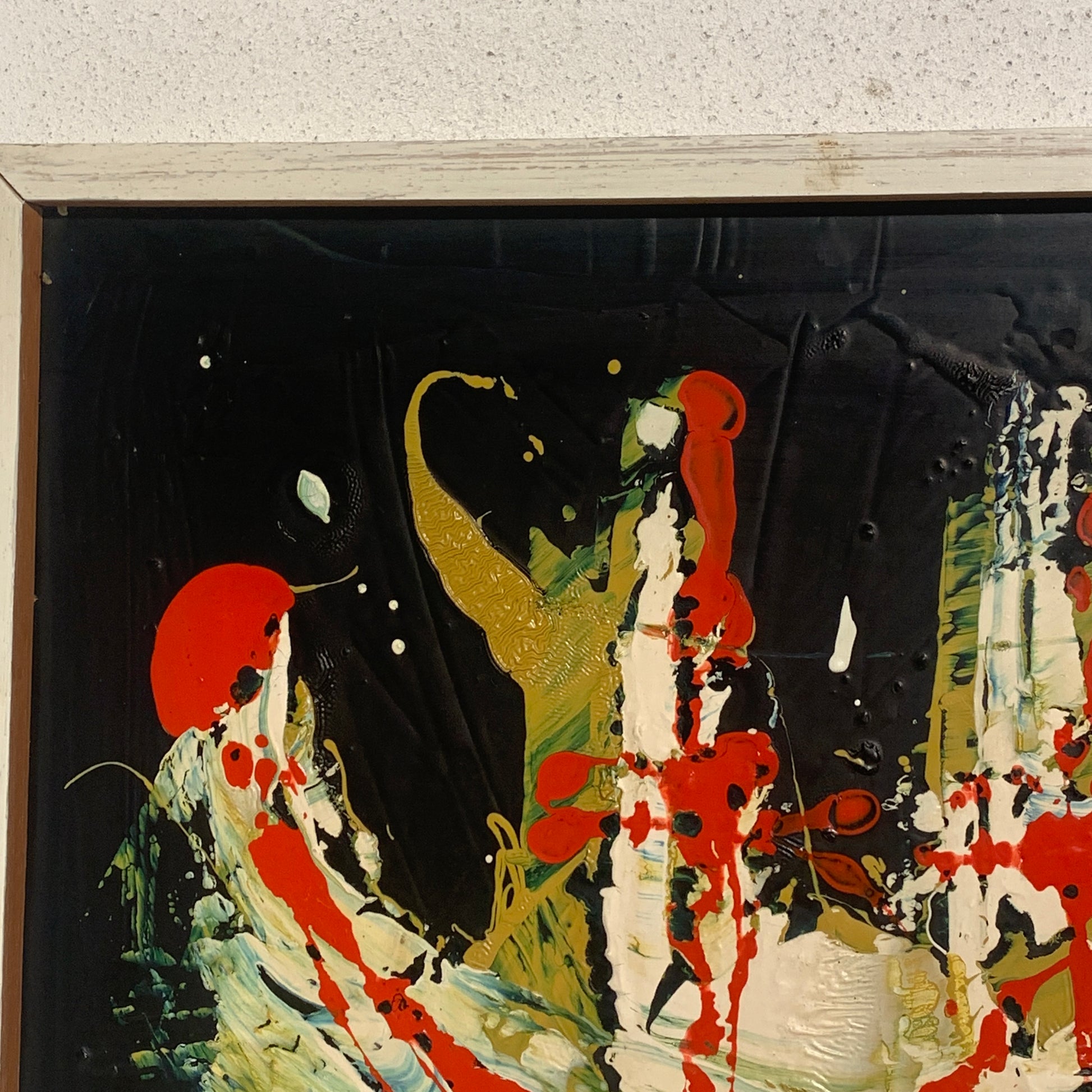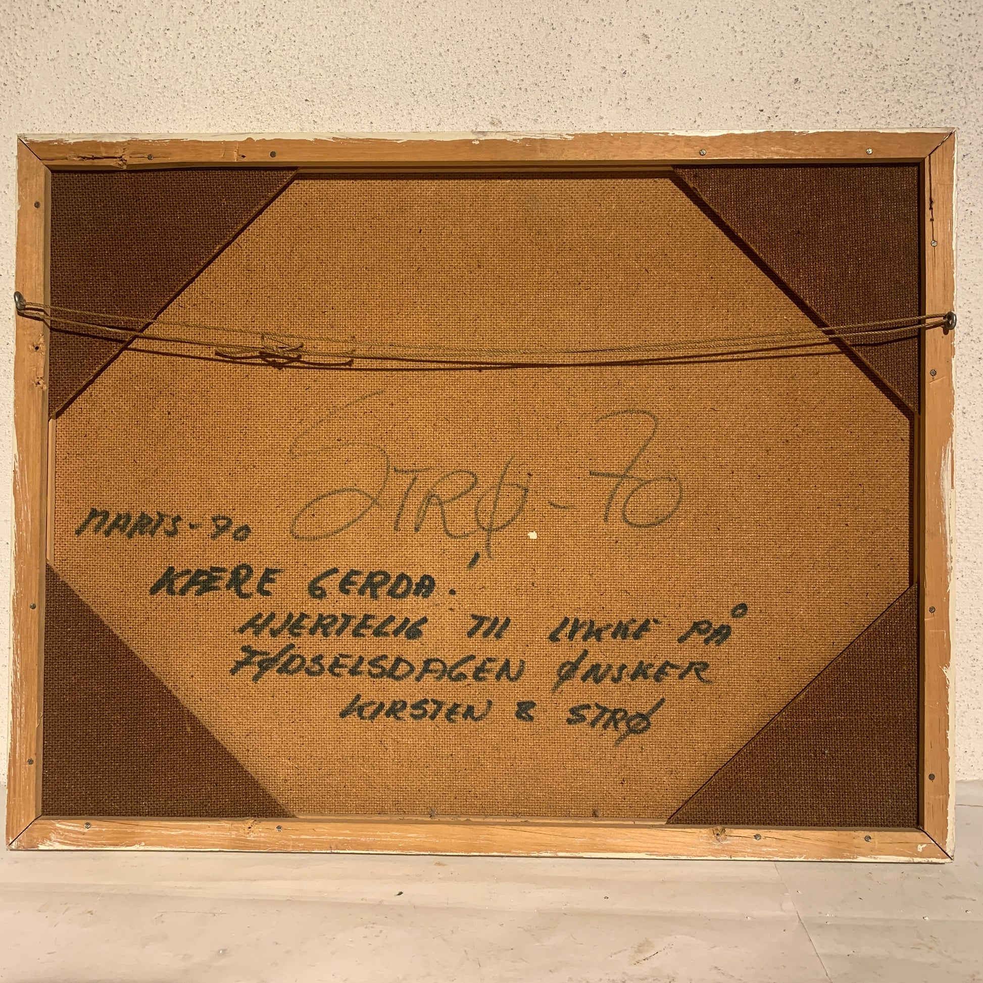 Ældre Abstrakt oliemaleri, fra 1970. Signeret: STRØ-70. Malet på plade. Monteret i hvidbemalet træramme. Tekst på bagside. Mål: ramme: ca. 39x51 Maleri: 35x47 cm. Stand: se billeder.