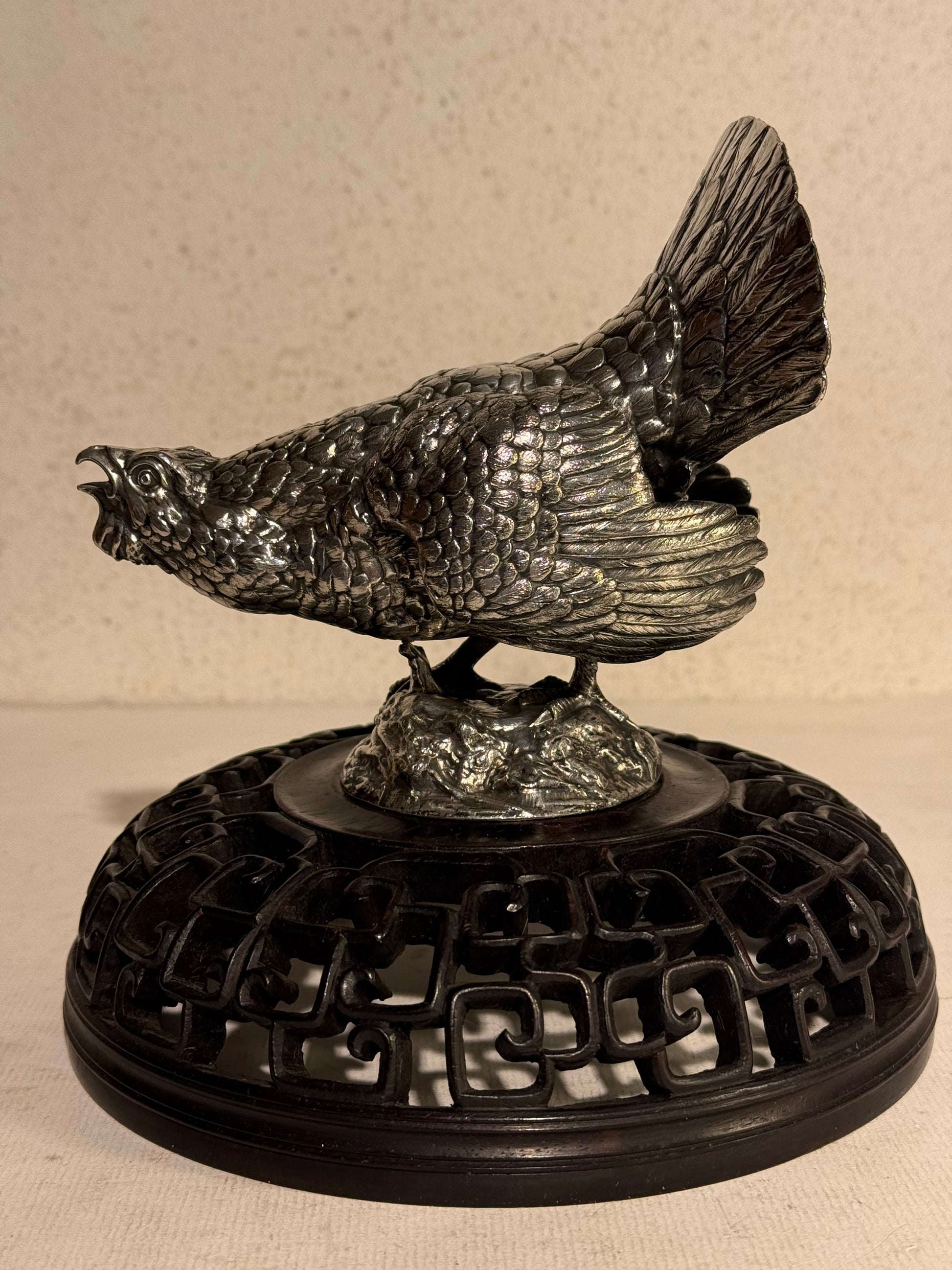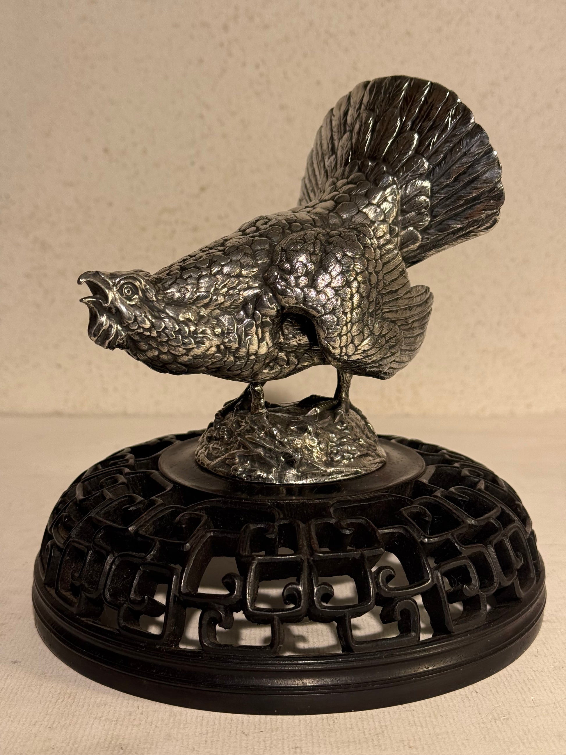 Antik sølvbelagt Tjur skulptur, monteret på smukt udskåret kinesisk træbase. Start 1900 tallet.Mål ca. : 17,5x17x17 cm. Stand: se billeder.