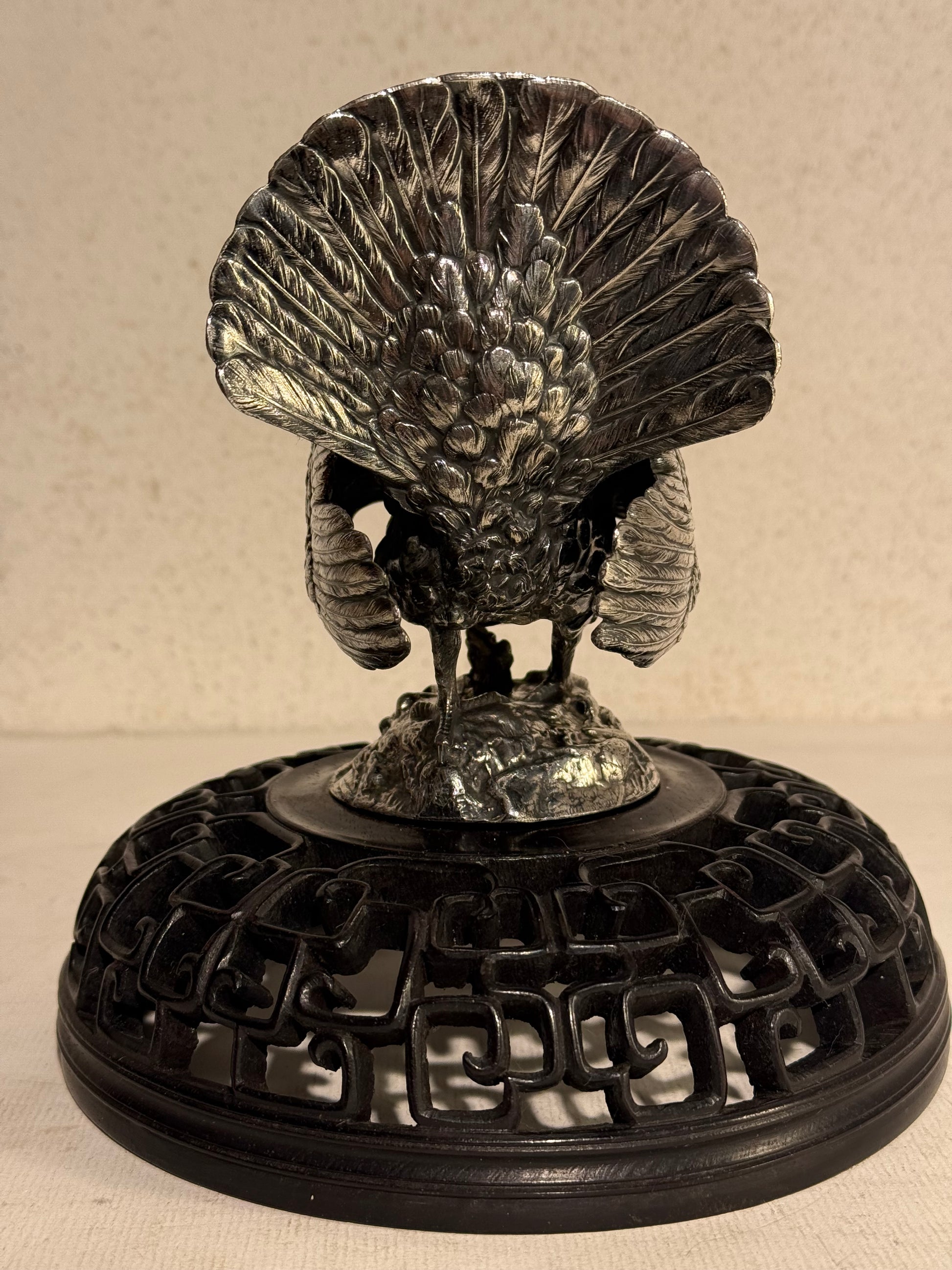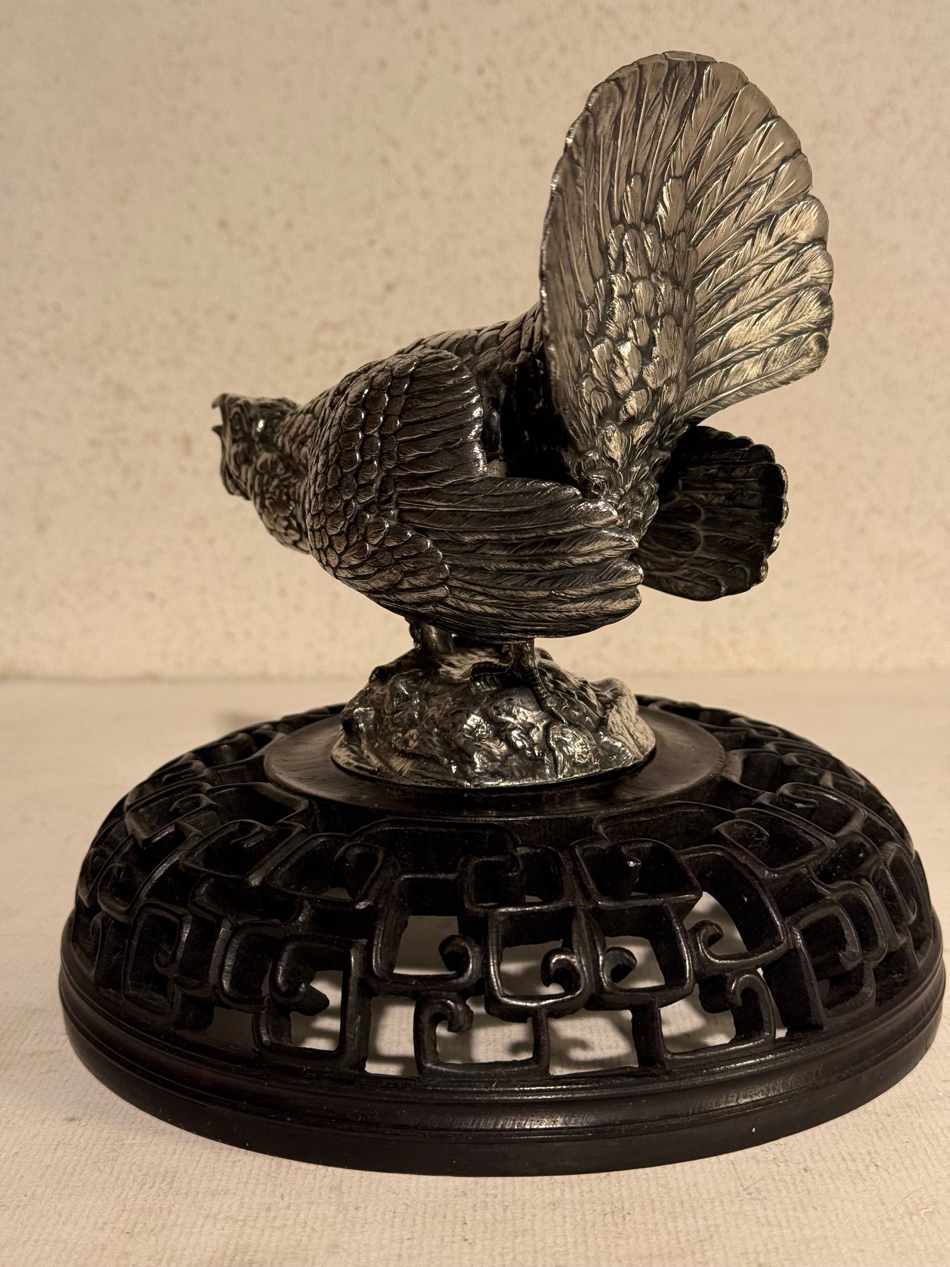 Antik sølvbelagt Tjur skulptur, monteret på smukt udskåret kinesisk træbase. Start 1900 tallet.