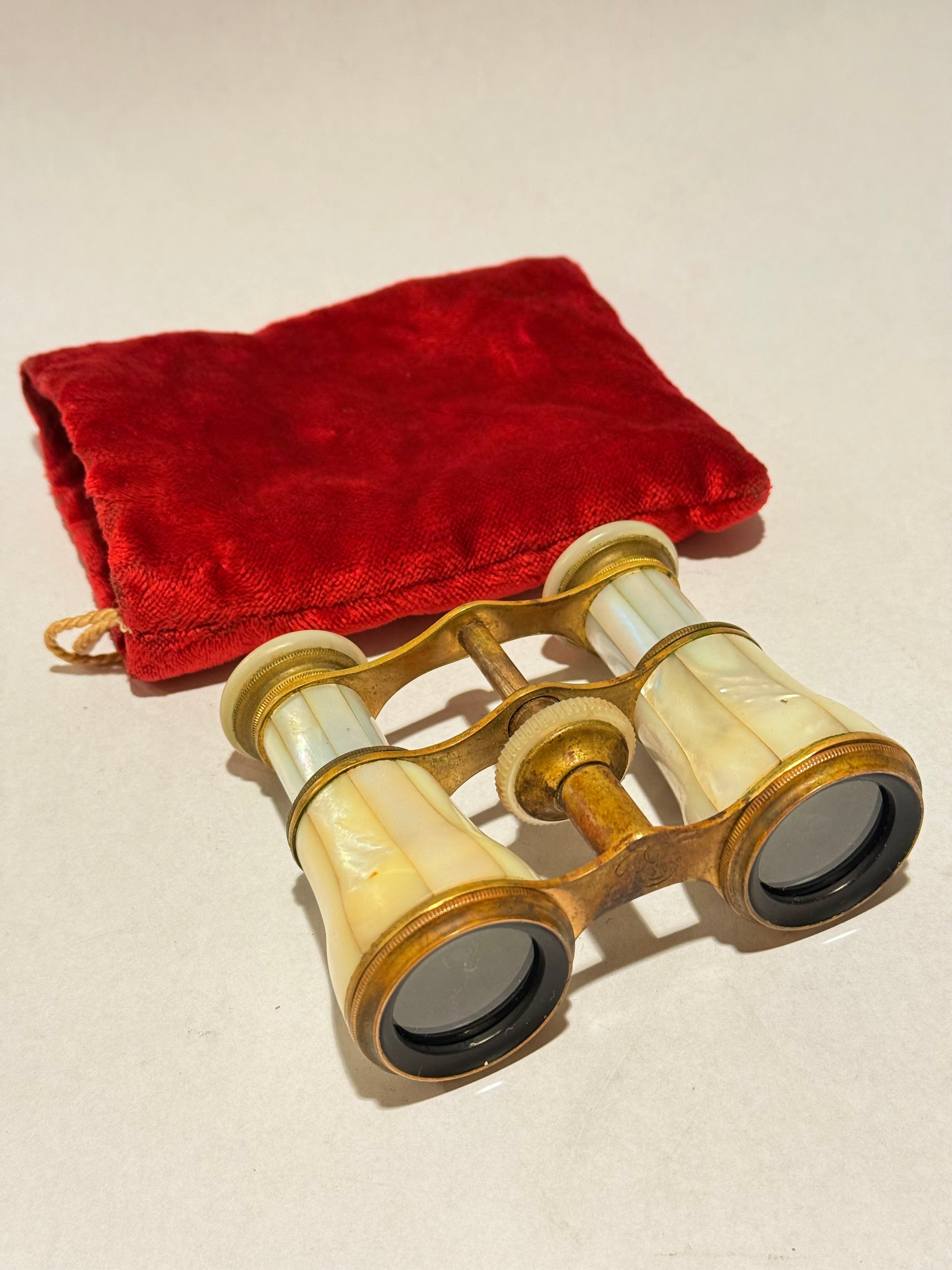 Antik teater kikkert, fra start 1900 tallet. Kikkerten er i messing, indlagt med perlemor. Rød velour pose medfølger. Mål : 8x10x4 cm. Stand: se billeder.