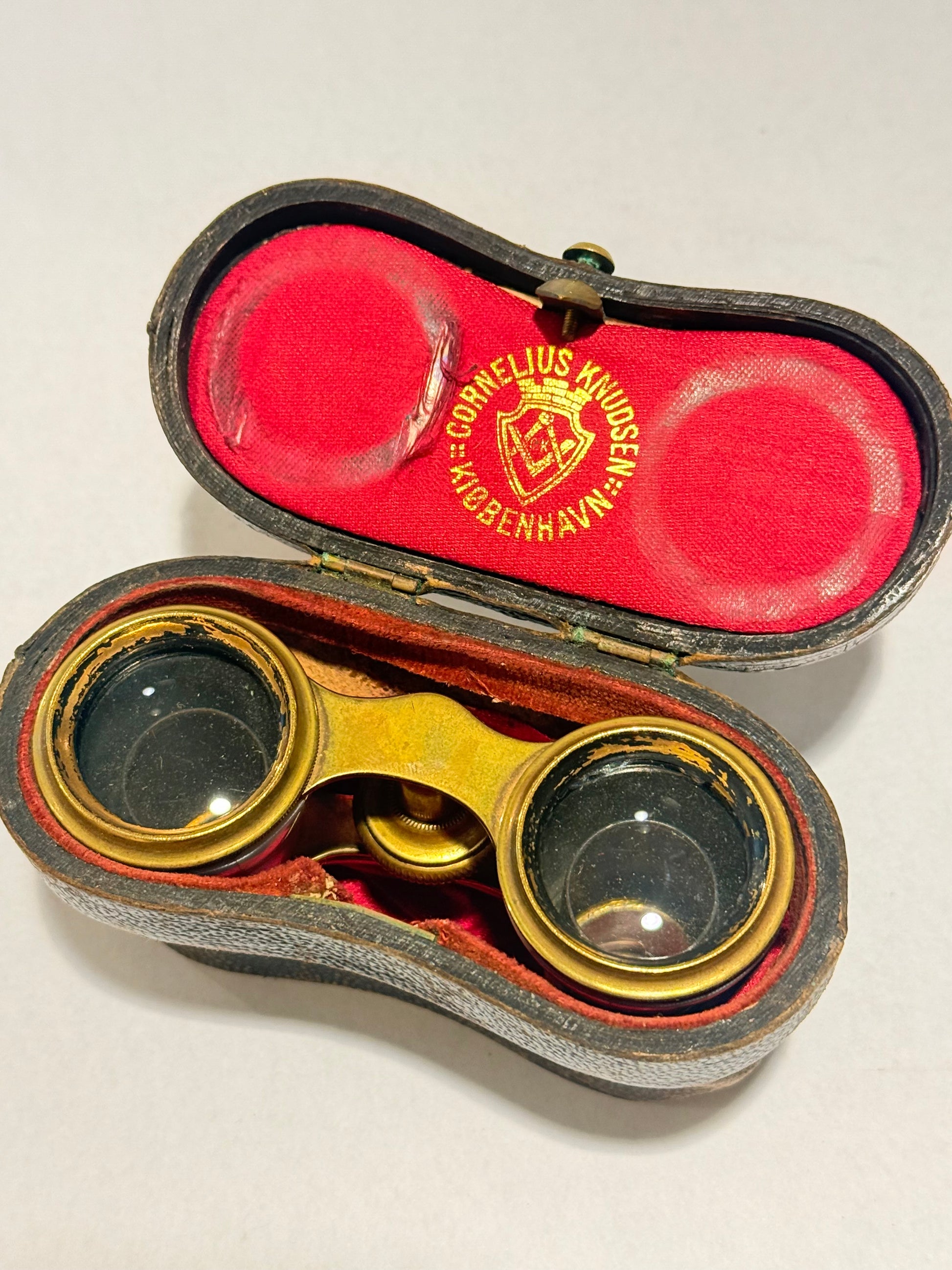 Antik teater kikkert, fra start 1900 tallet. Kikkerten er i messing, indlagt med perlemor. Kikkert etui medfølger. Mål : 8x10x4 cm. Stand: se billeder.