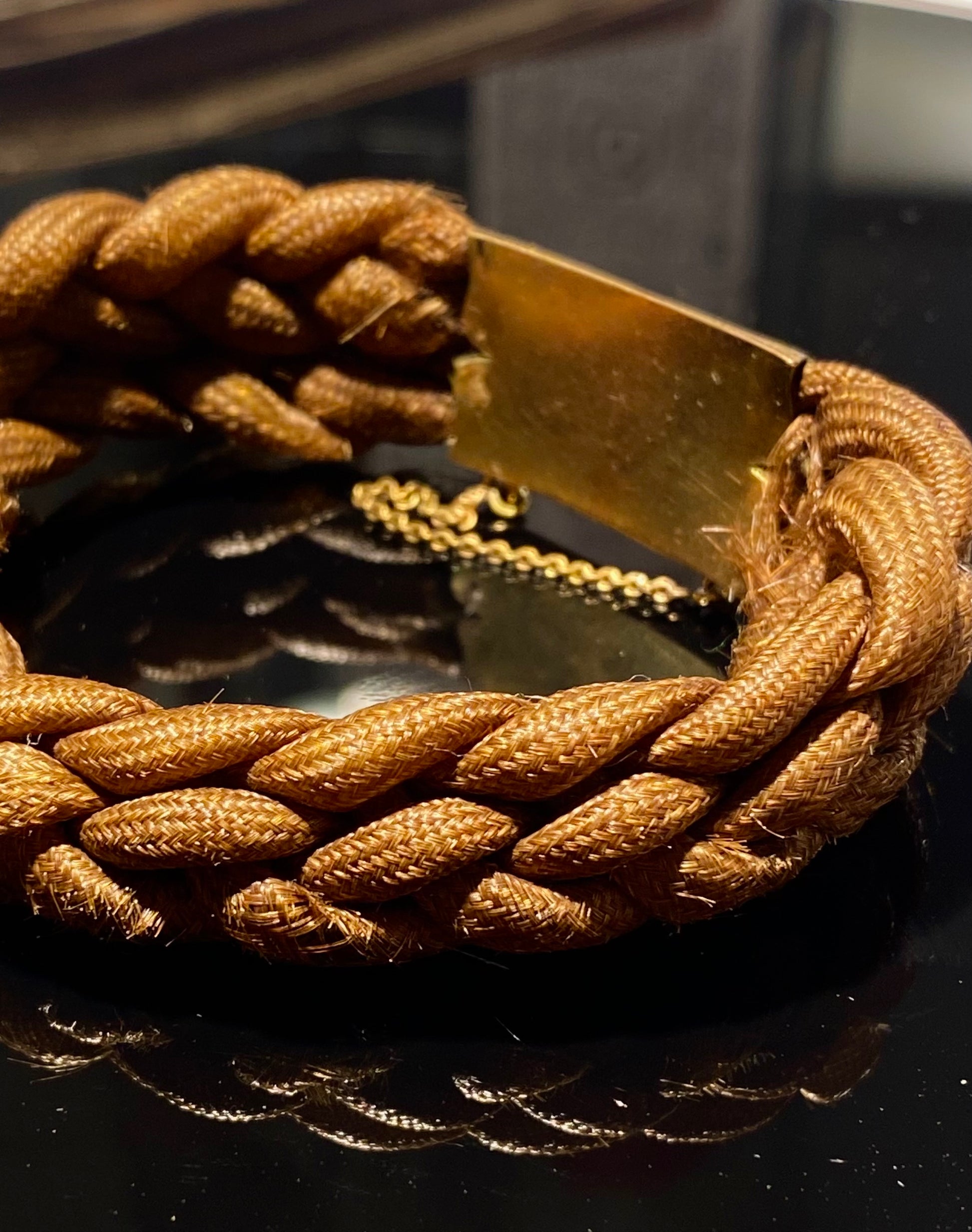 Victoriansk sørgesmykke armbånd, fra 1800-tallet, lavet af ægte menneskehår - tæt vævet og flettet - og guldbelagt metal med smukke, håndlavede indgraveringer.
