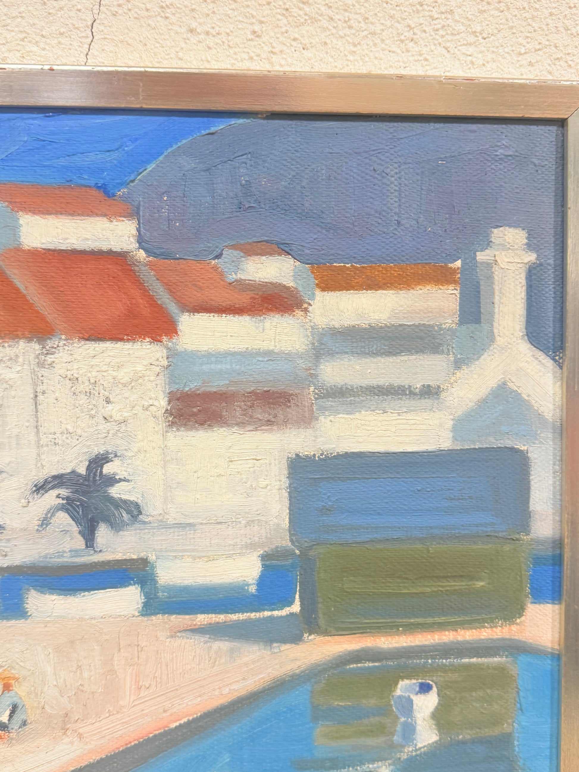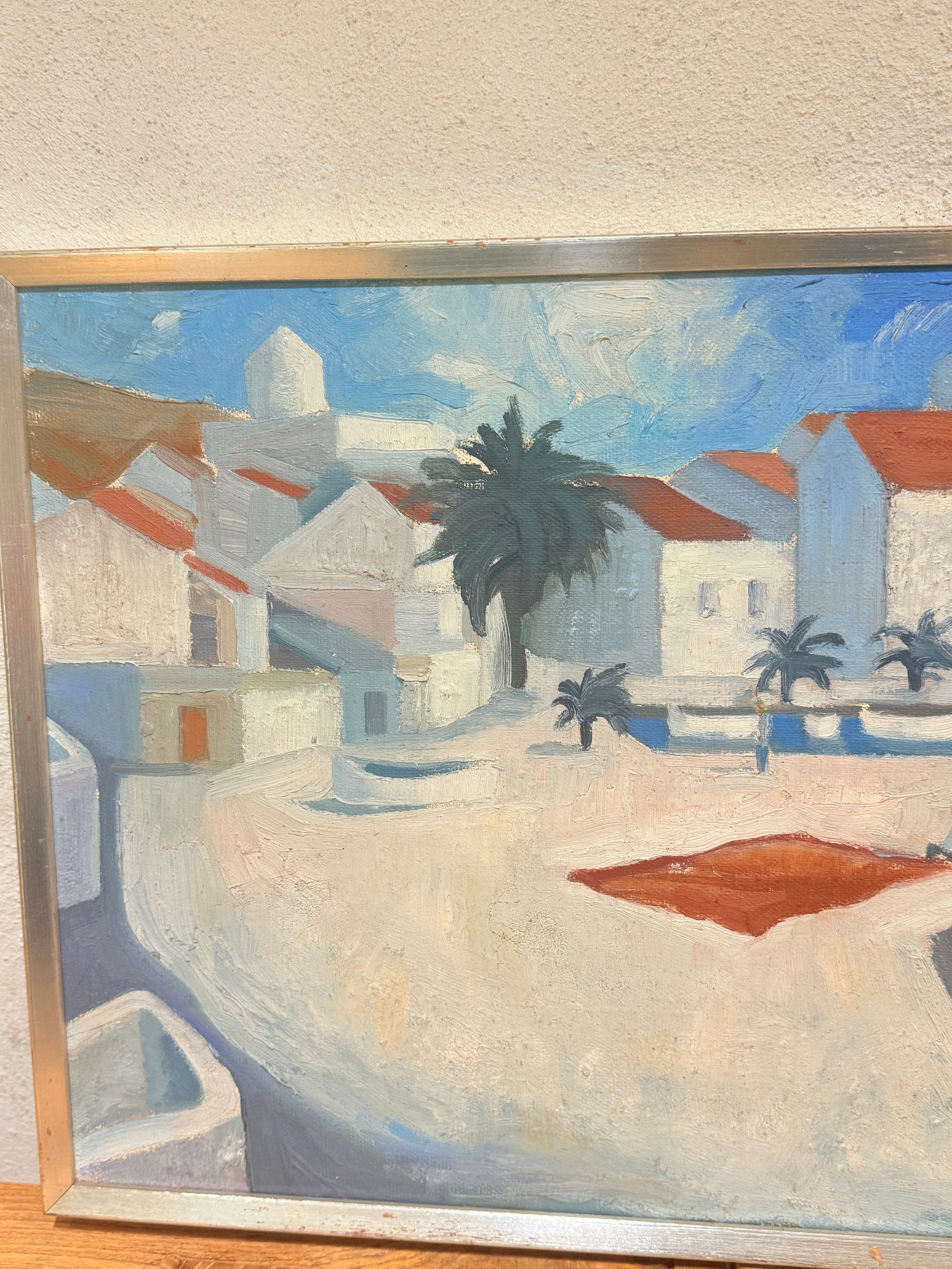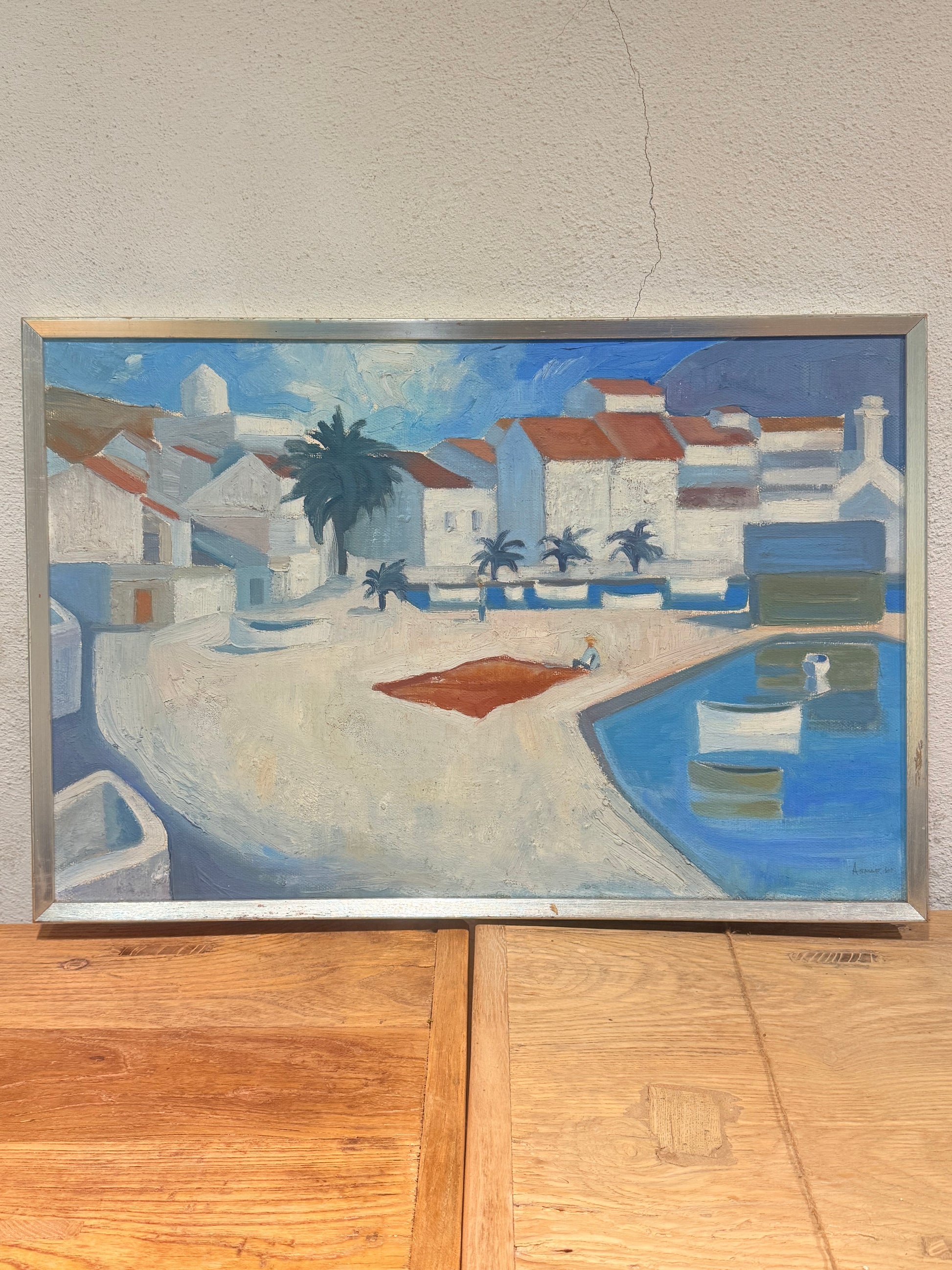 Stemningsfuldt oliemaleri udført i blå og hvide nuancer med et karakteristisk kubistisk udtryk. Forestiller en middelhavsinspireret havneby med hvide huse, palmer og både i vandet. Malet i en stil, der minder om danske og sydeuropæiske kubister/modernister fra 1950–60’erne, Glarmesterstempel fra Wildersgade 23, København.