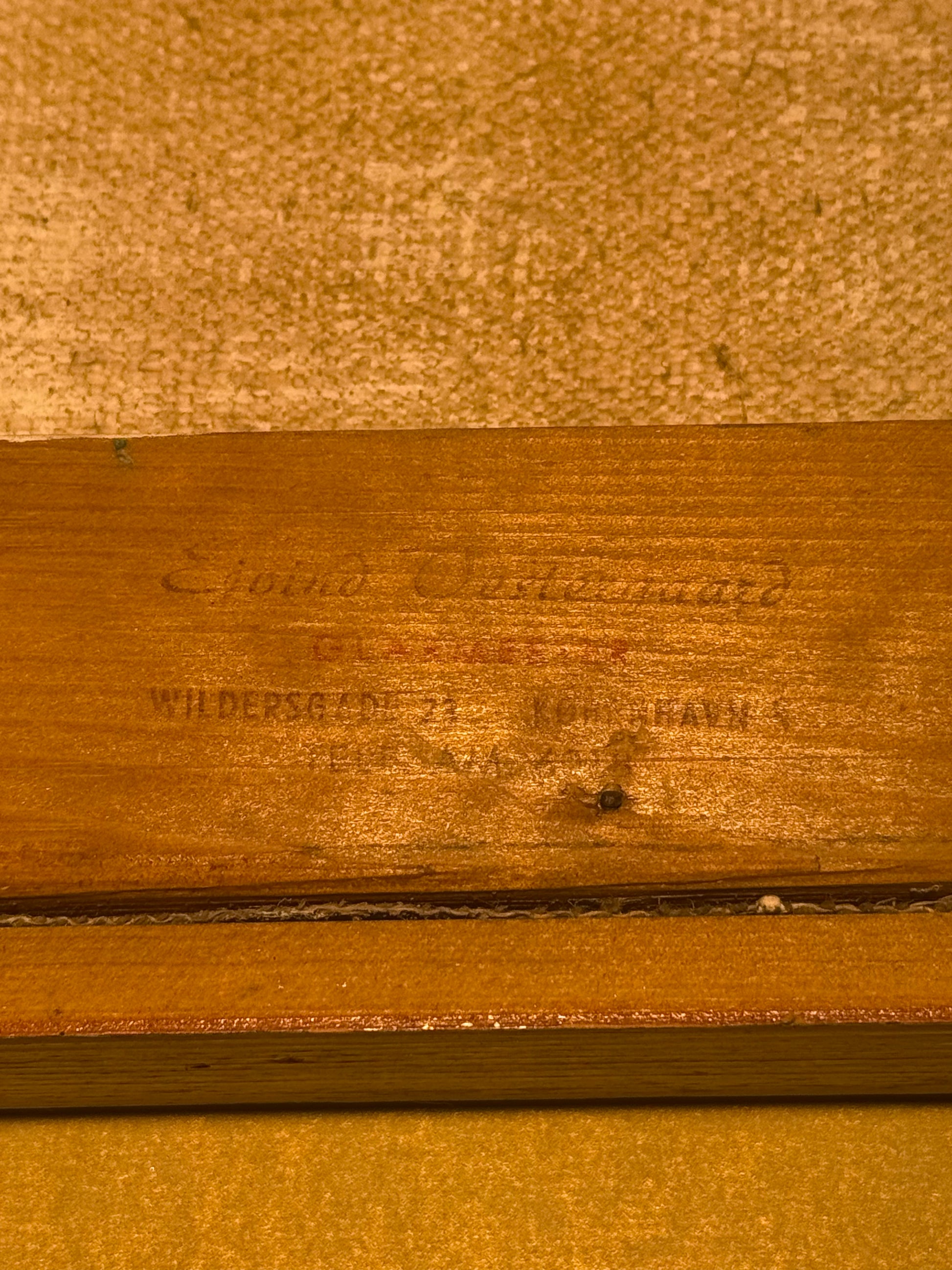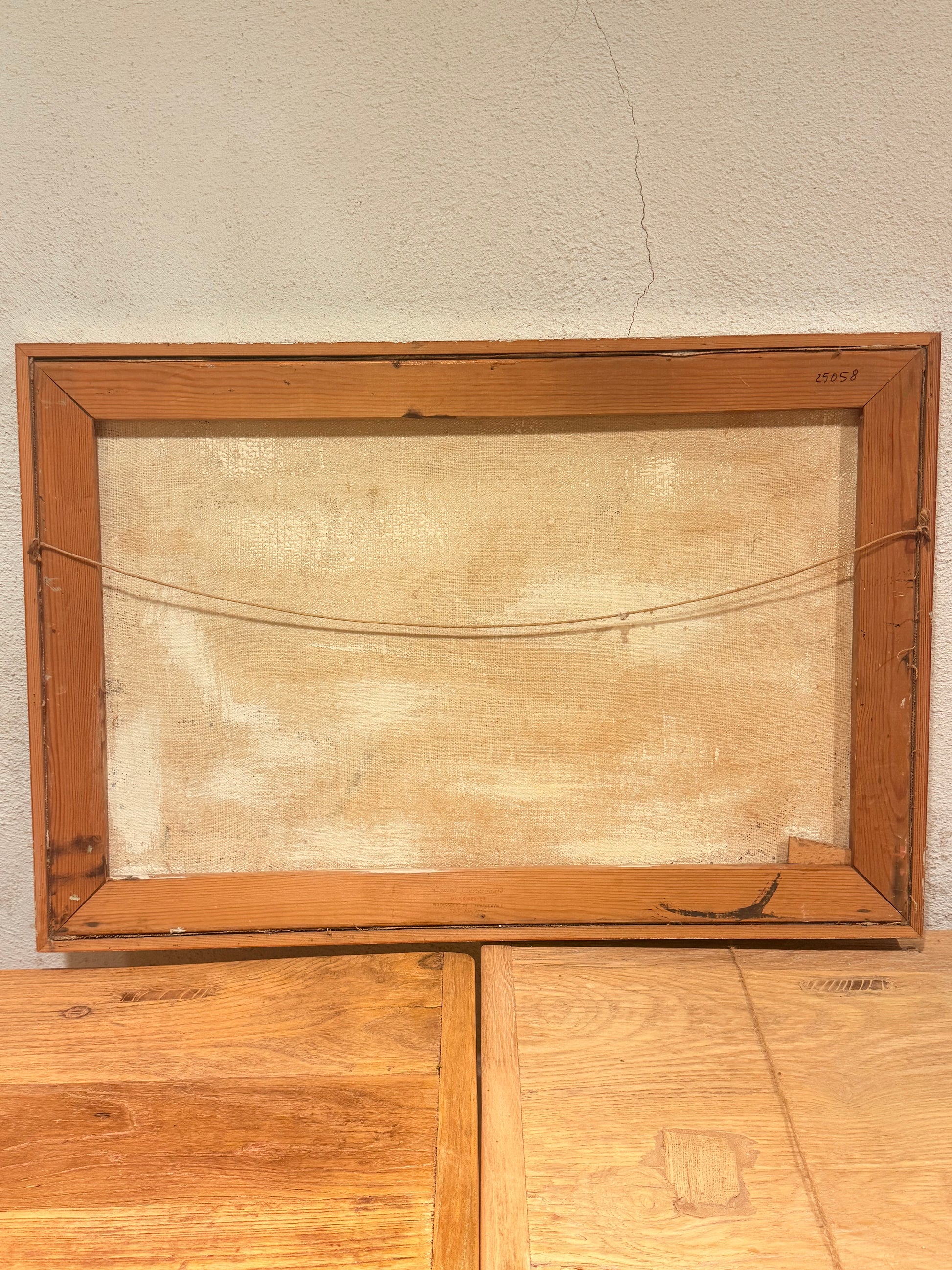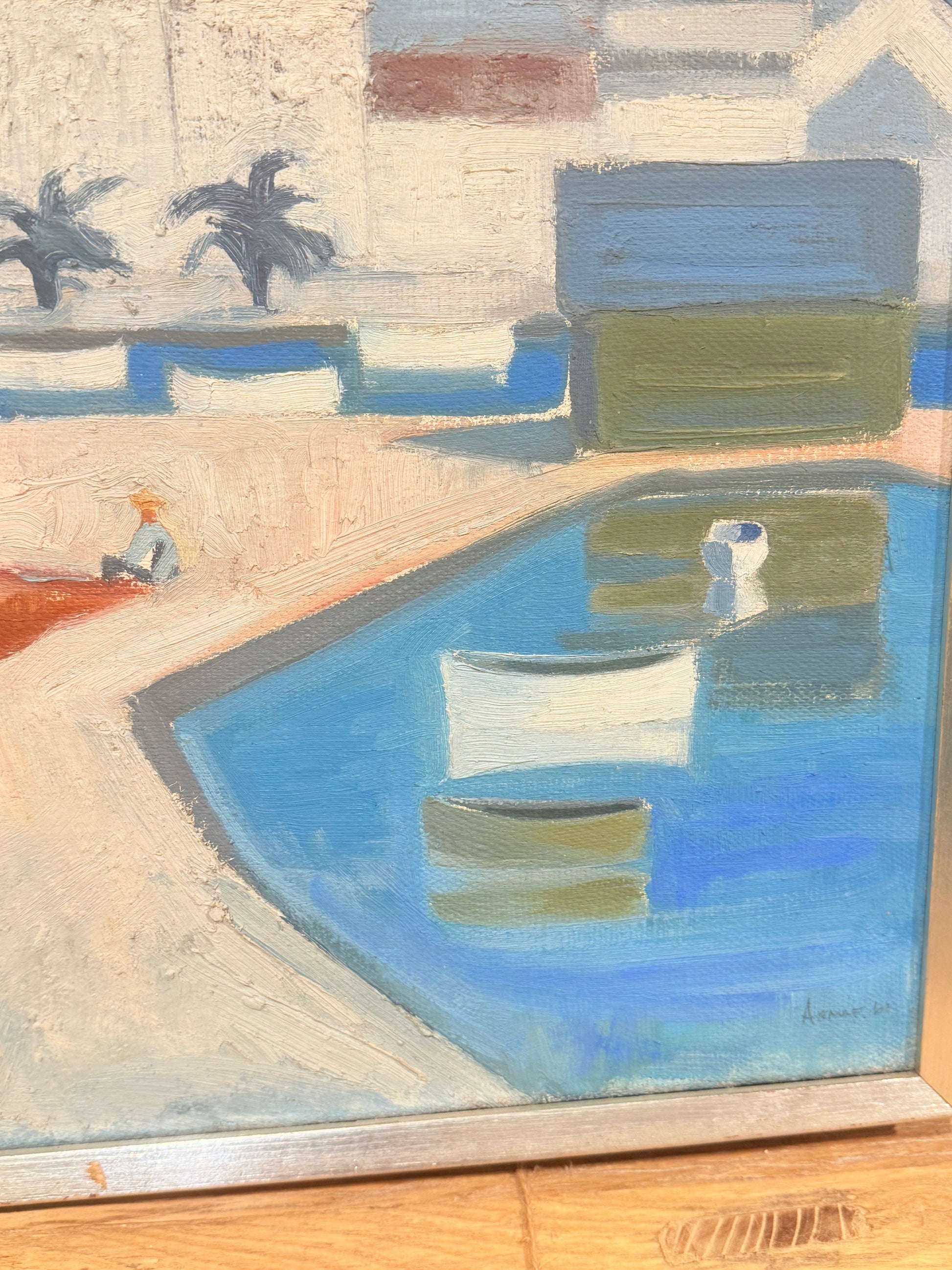 Stemningsfuldt oliemaleri udført i blå og hvide nuancer med et karakteristisk kubistisk udtryk. Forestiller en middelhavsinspireret havneby med hvide huse, palmer og både i vandet. Malet i en stil, der minder om danske og sydeuropæiske kubister/modernister fra 1950–60’erne, Glarmesterstempel fra Wildersgade 23, København.