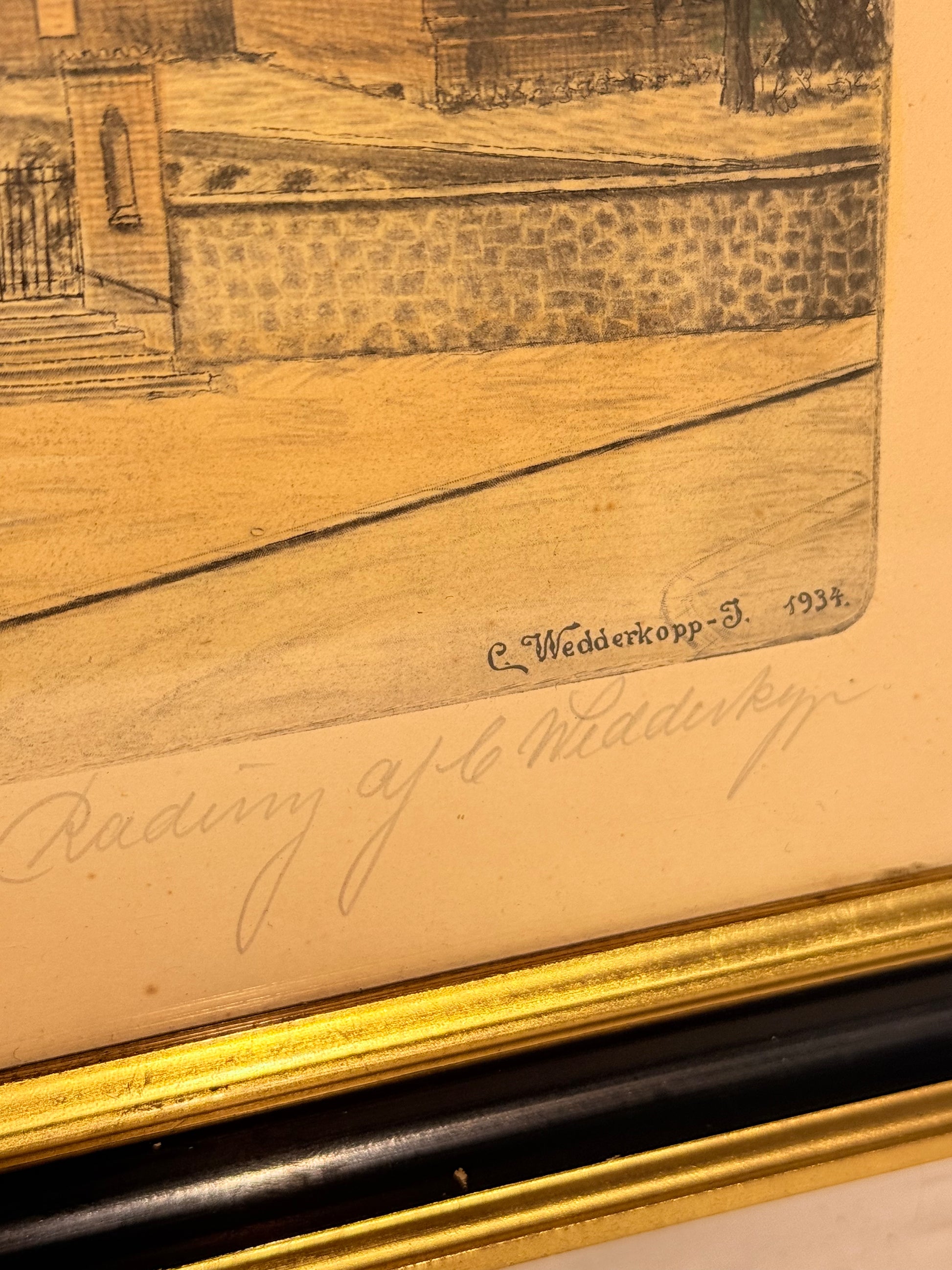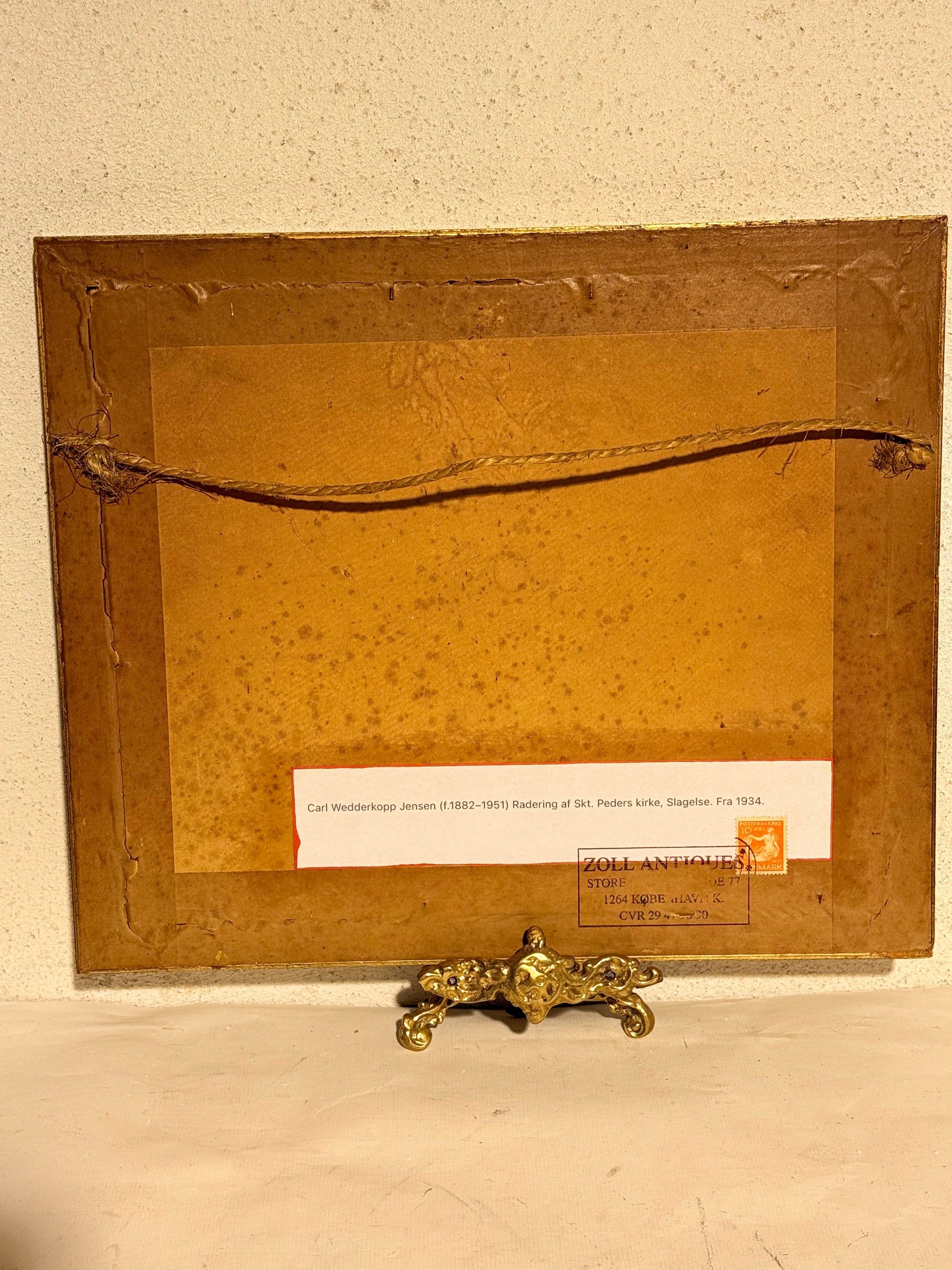 Carl Wedderkopp Jensen (f.1882–1951) Farvelagt radering af Skt. Peders kirke, Slagelse. Fra 1934.Signeret: C.Wedderkopp.J. 1934. Dette er en original radering. Monteret i ældre guld & sort bemalet træ ramme og glas.
