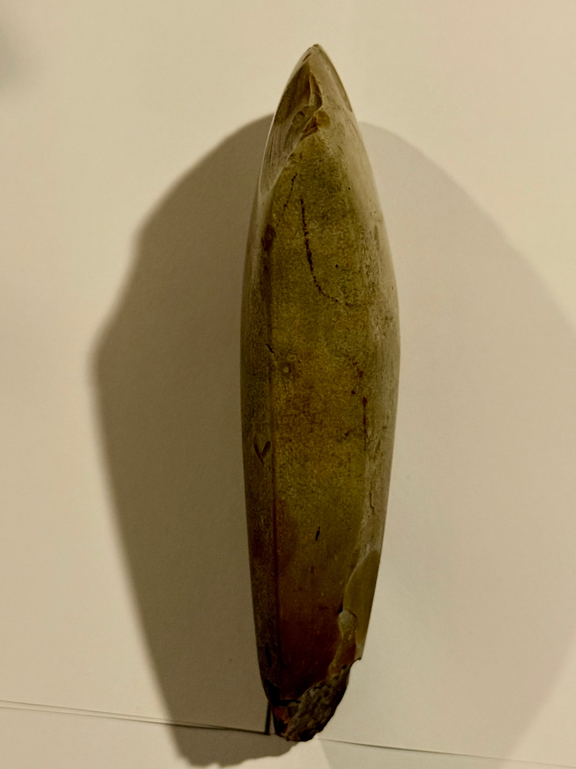Dansk oldsag. Spidsnakket firsidet flintøkse. Type lll. Tragtbægerkultur.