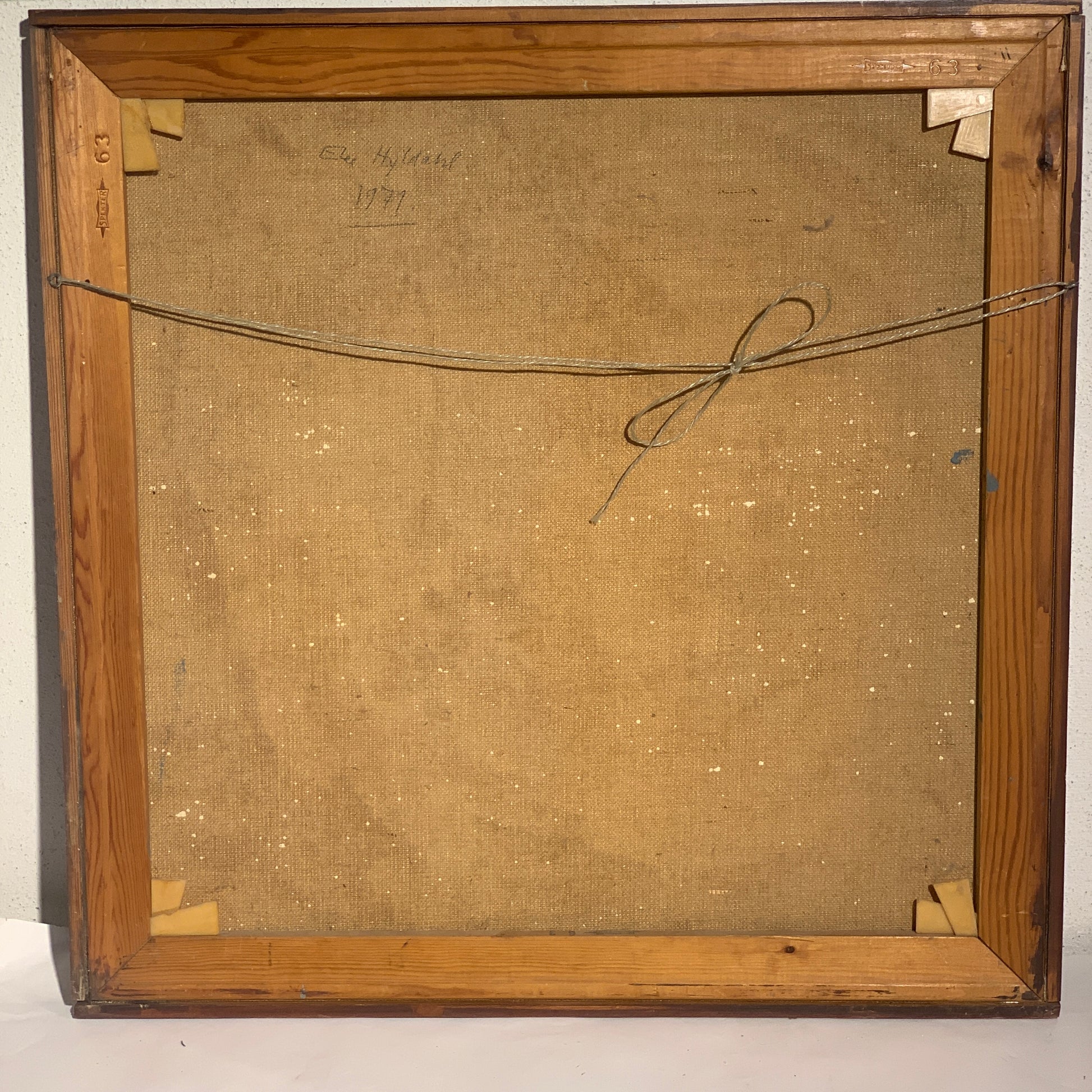 Else Hyldahl (f.193)Abstrakt oliemaleri på lærred, fra 1971. Signeret: Else Hyldahl. På bagsiden: ELSE HYLDAHL 1971. Monteret i træramme. Om kunstneren: Om kunstneren: Som maler begår Else Hyldahl sig fortrinsvist i det abstrakte udtryk. Hun modtog den 18. november 2017 "Kunstnerforeningen af 18. november"s Pris. Mål: Ramme: 65,5x65,5 cm. Lærred: 63,5x63,5 cm. Stand: Se billeder.