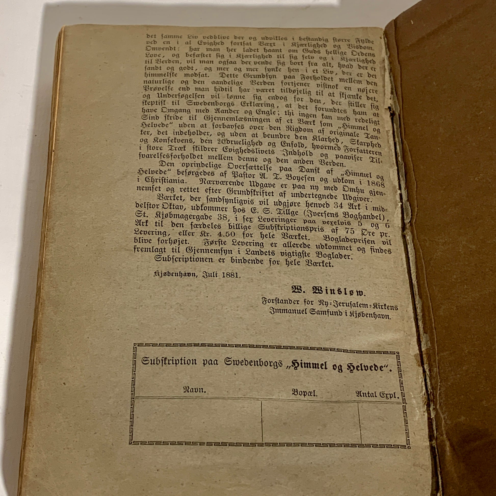 Emanuel Swedenborg. Om Himlen og dens Undere og om Helvede , fra 1882. 2.Udgave, 1.Oplag.
