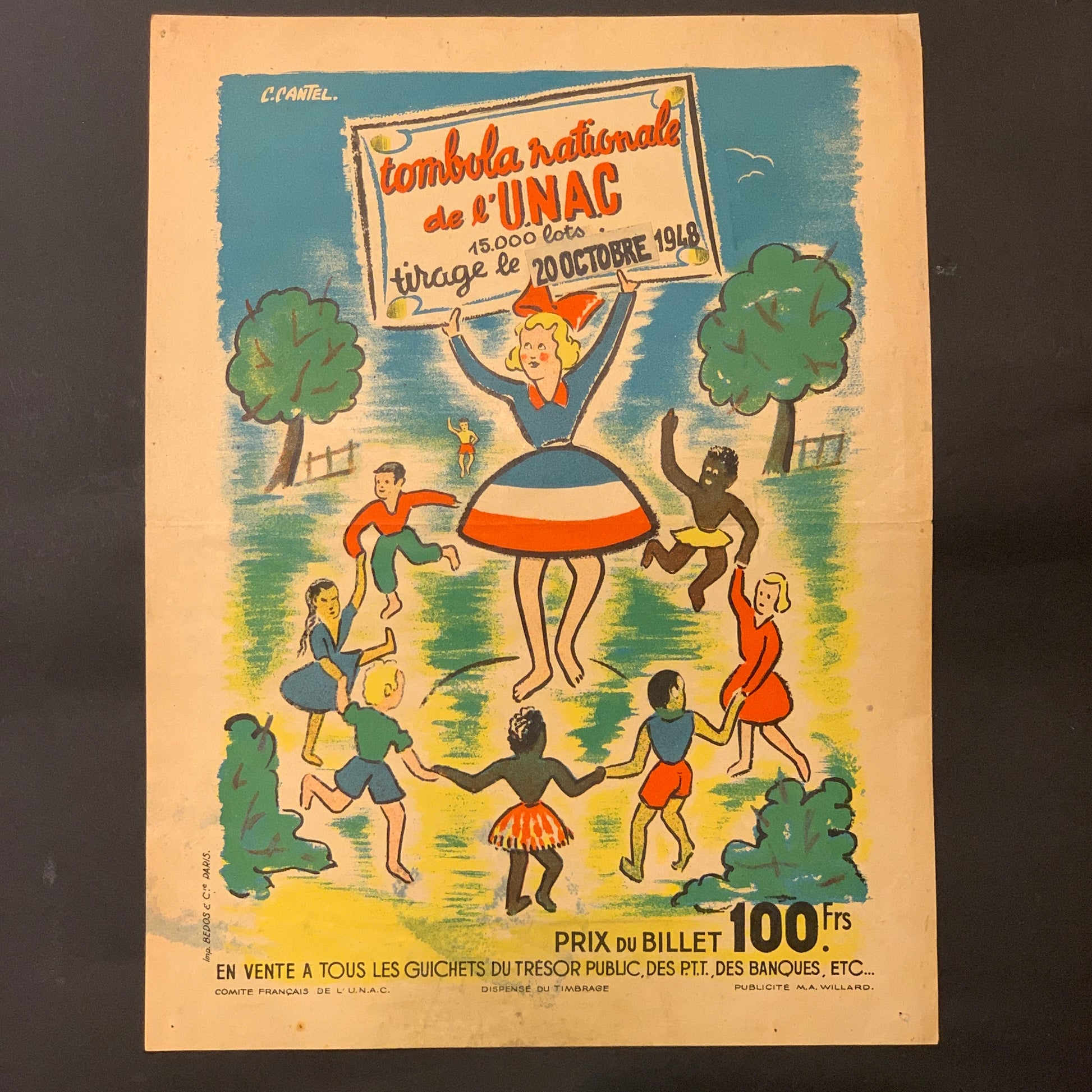 Original fransk “Tombula Nationale” lithografisk plakat,fra 1948. Tegnet af C.Cantel .Mål: ca. 40x30 cm. Stand:Restaurationer iform af revnesikring m.m. På bagside, ellers se billeder.