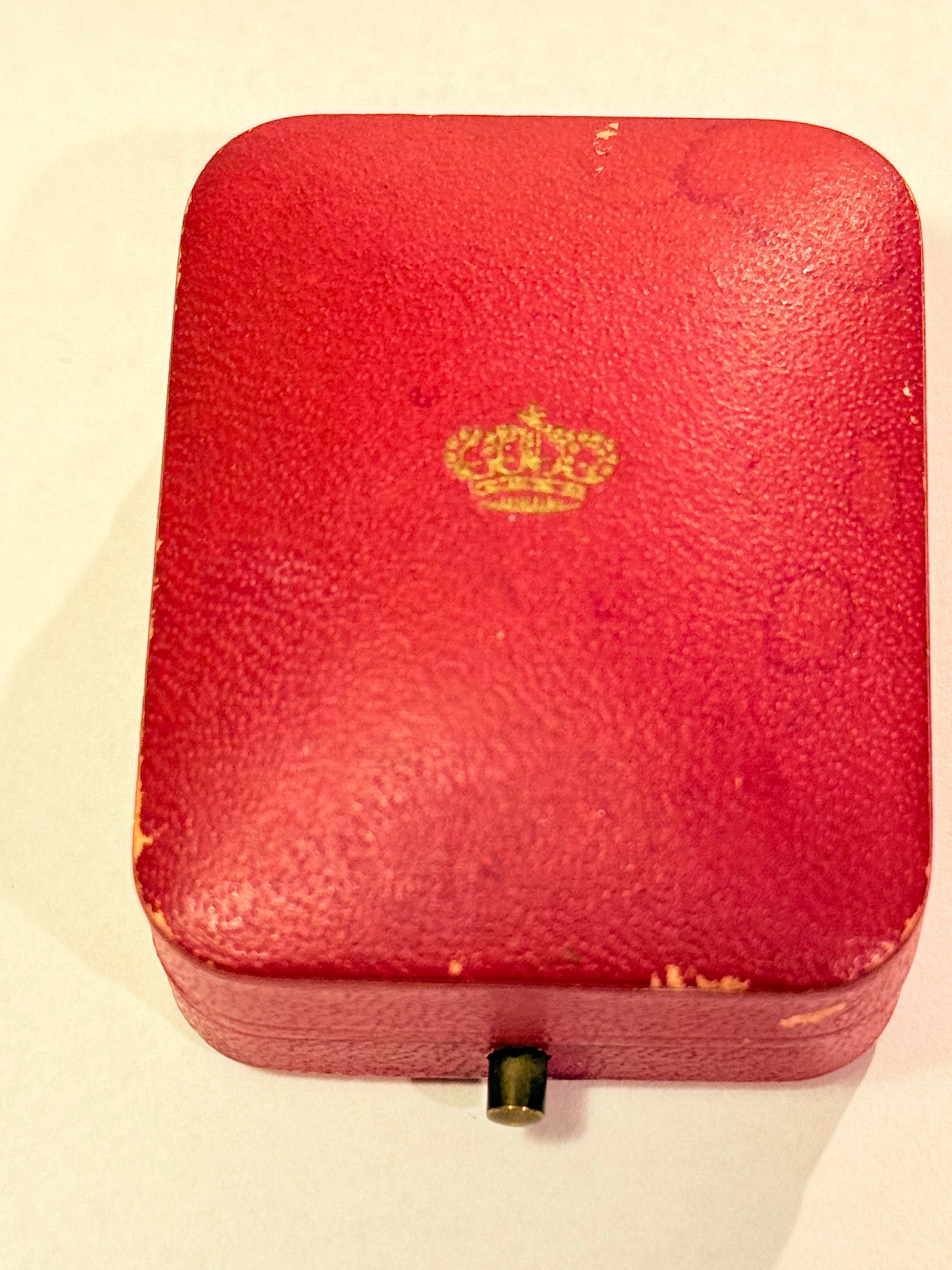 Georg Jensen Guld Chr.X. Kongemærke 1870-1945 til knappehul, i 14 karat Guld og rød emalje. Med æske. Stemplet: 585, GJ. H: 2,5cm. Vægt: ca. 3,8g. Stand: se billeder.