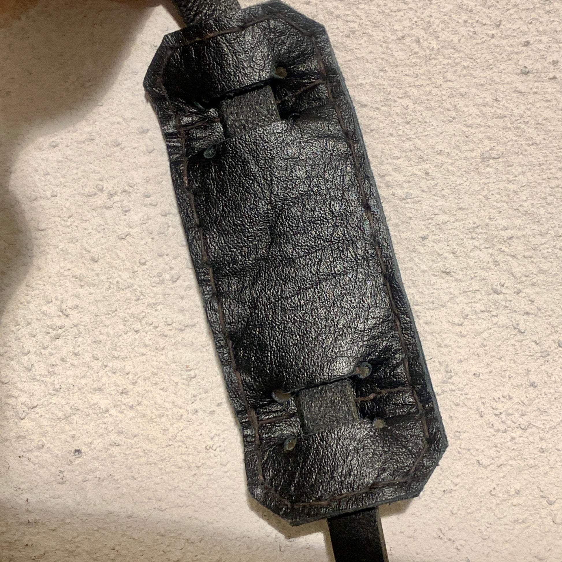 Unik håndsyet stor skuldertaske i tykt genbrugt mørkebrunt møbel læder med læder på ydersiden og ruskind på indersiden. Remmen er oprindeligt et læder bælte og skulderklappene er i tykt bøffellæder. Tasken er designet og håndsyet af Kim Zoll. Mål: Taske B: 35 cm. H: 36 cm. Rem: L: 100 cm.