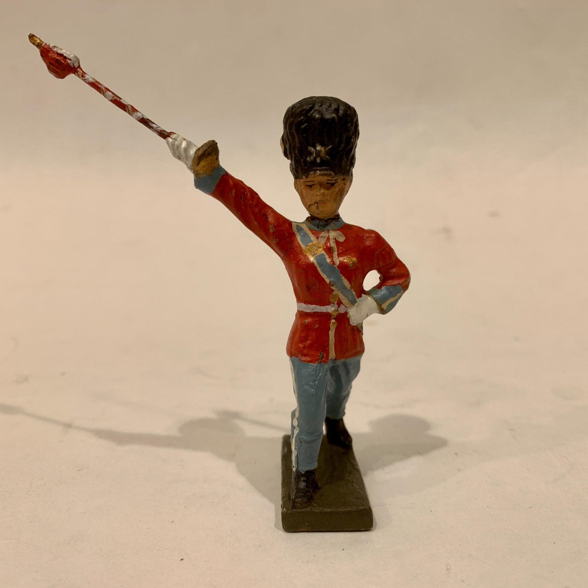 Lineol Kongelig Livgarder tambourmajor. Fra 1930/1940érne. Mål: ca. H:8,5cm. (model foto) Flere haves. Figurene er håndmalet og variere i farve og udtryk, standen variere også. Stand: Brugsspor, krakeleringer mm. Restaureringer kan forekomme.