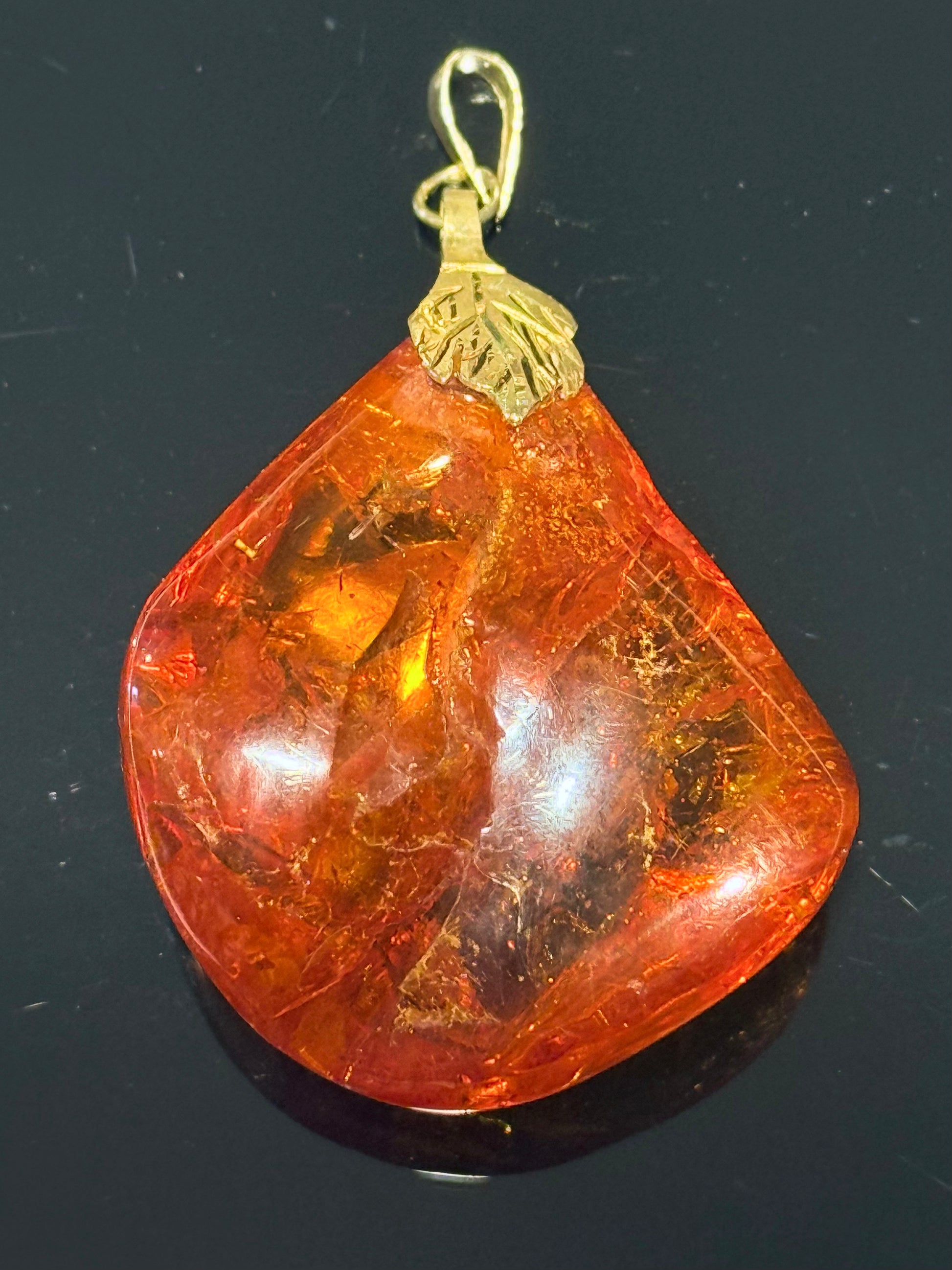 Stort vintage vedhæng i 14K guld og rav. Smuk bladornamentik i guld monteret på toppen af den store dråbeformet ravklump. Stemplet: 585. Totalvægt: 20,9 g. Mål: 7x4x2 cm. Stand: se billeder.